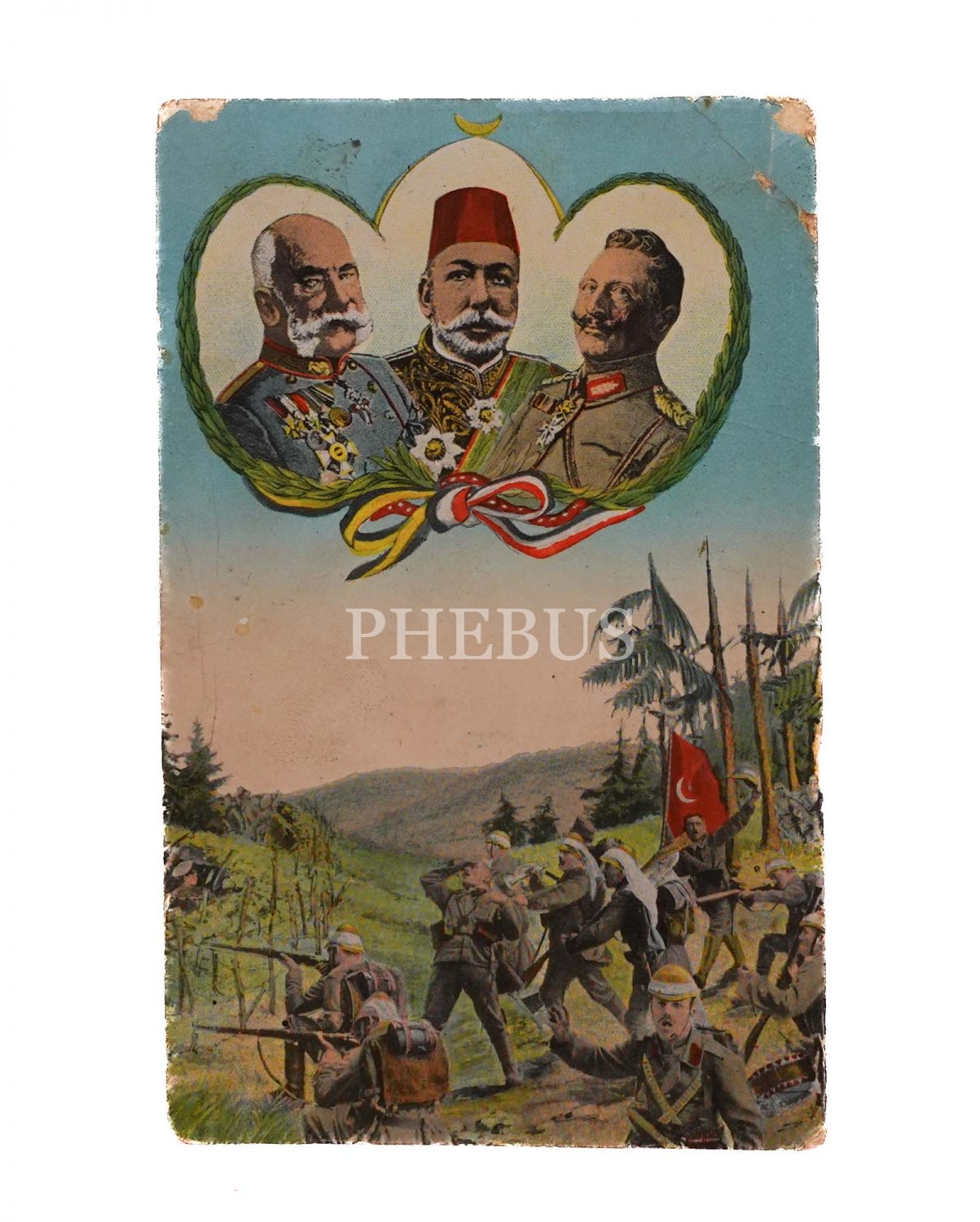 Sultan Mehmed Reşad, Franz Joseph ve Kayzer Wilhelm portreleriyle; Türk sancağı ile hücuma kalkan askerler görselli İttifak kartpostalı, 13x8 cm...