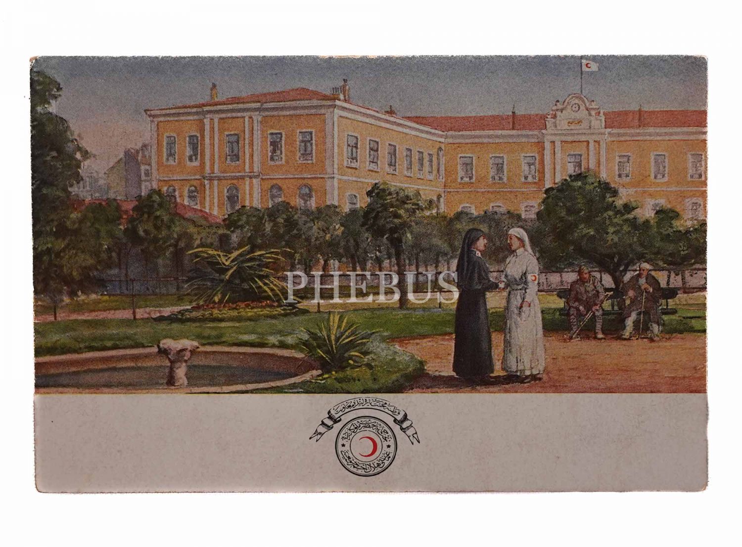 Hilal-i Ahmer Cemiyeti´ne bağlı bir hastanenin bahçesinde sohbet eden hemşireler ve bir köşede dinlenen gaziler, ed. Hilal-i Ahmer Cemiyeti, 14x9 cm...