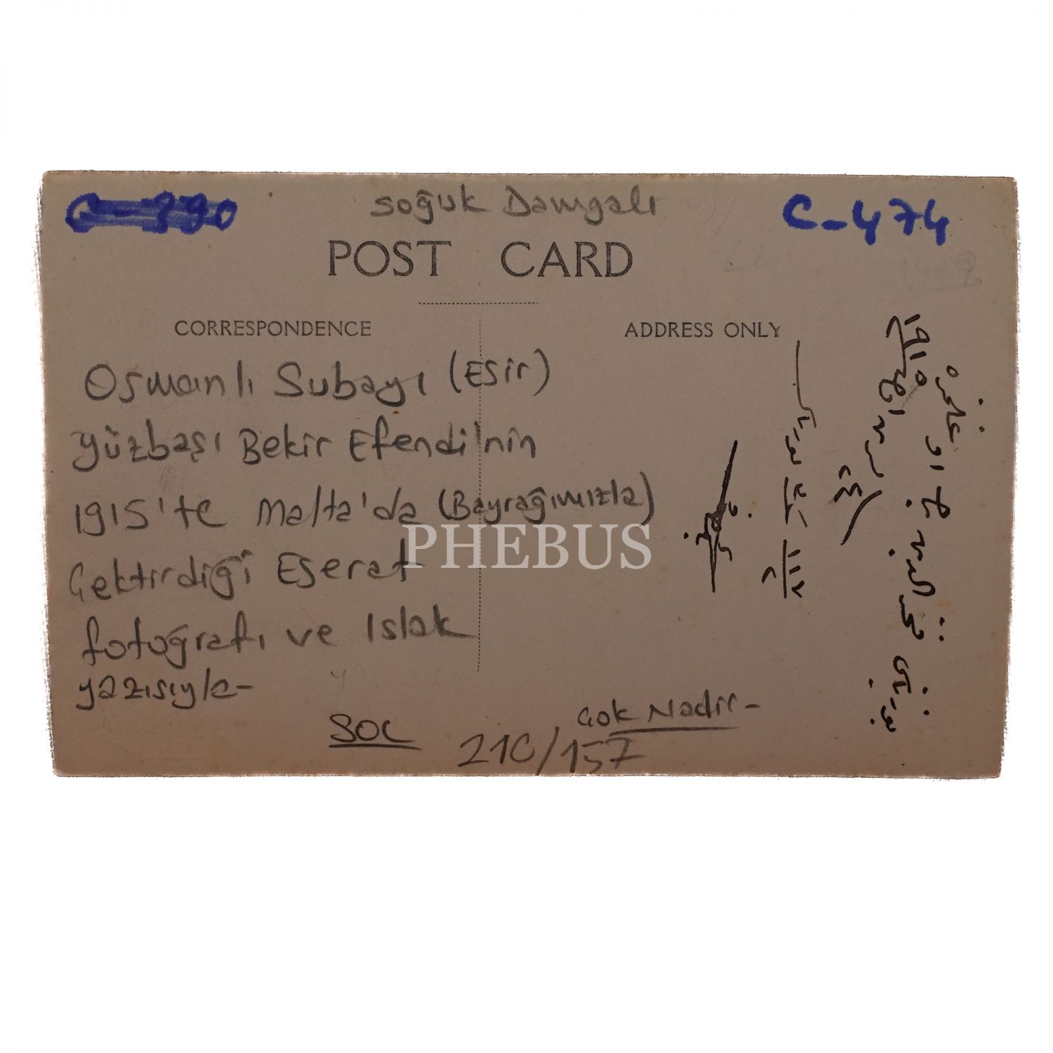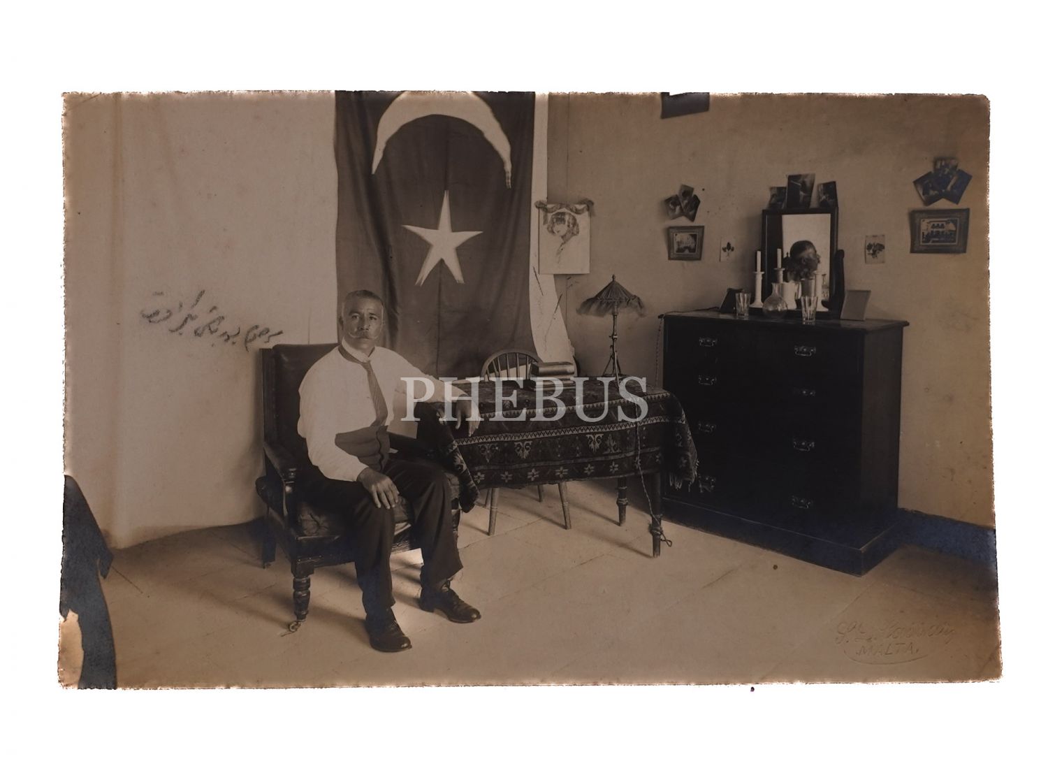 Malta´da esir bulunan Yüzbaşı Bekir Efendi´nin, Türk bayrağı asılı bir odada aldırdığı, ithaflı ve imzalı esaret hatırası fotoğrafı, "S. L. Cassar - Malta" soğuk damgalı, 14x9 cm...