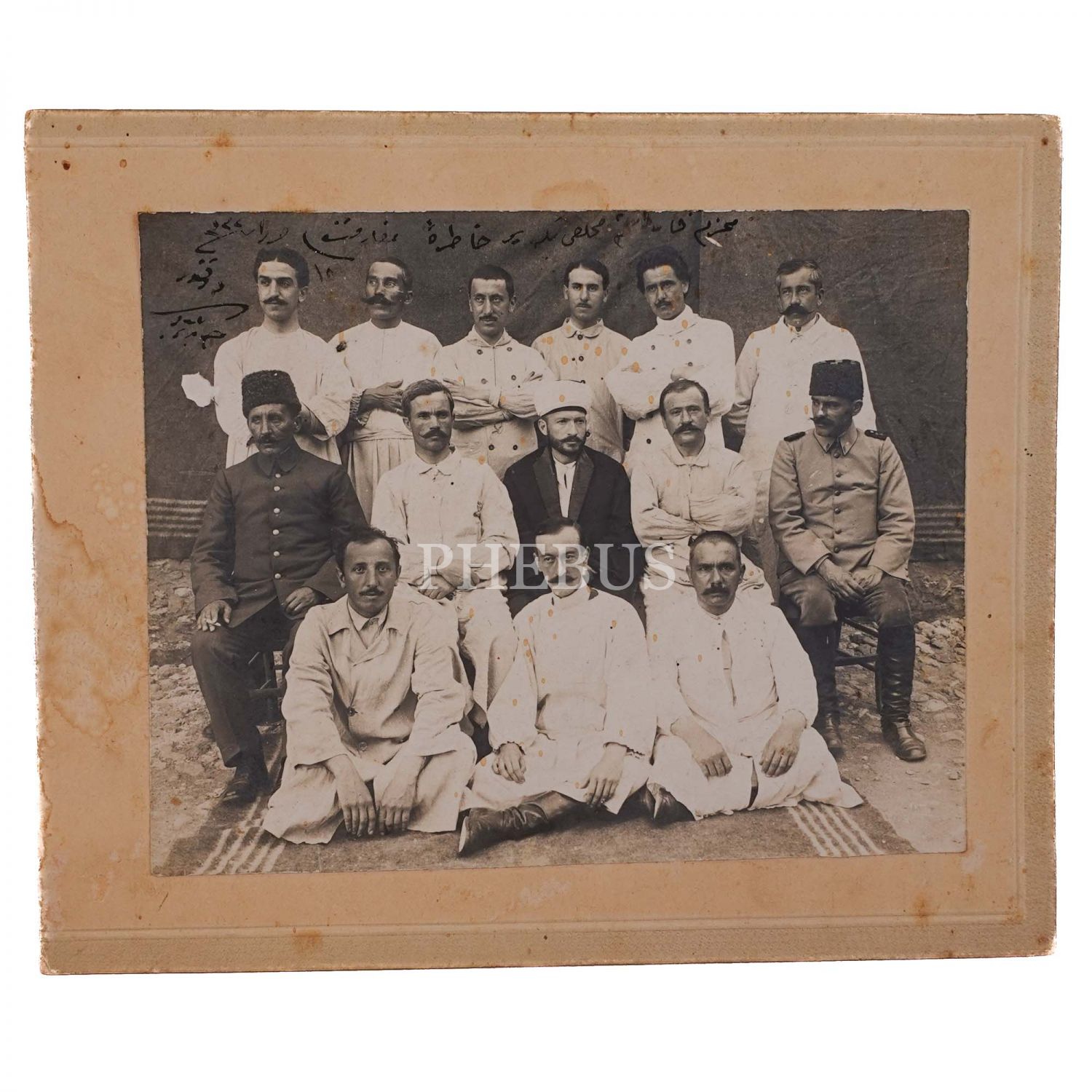Osmanlı döneminden bir grup doktor, iki subay ve bir hocanın yer aldığı toplu hatıra fotoğrafı, ithaflı ve imzalı...