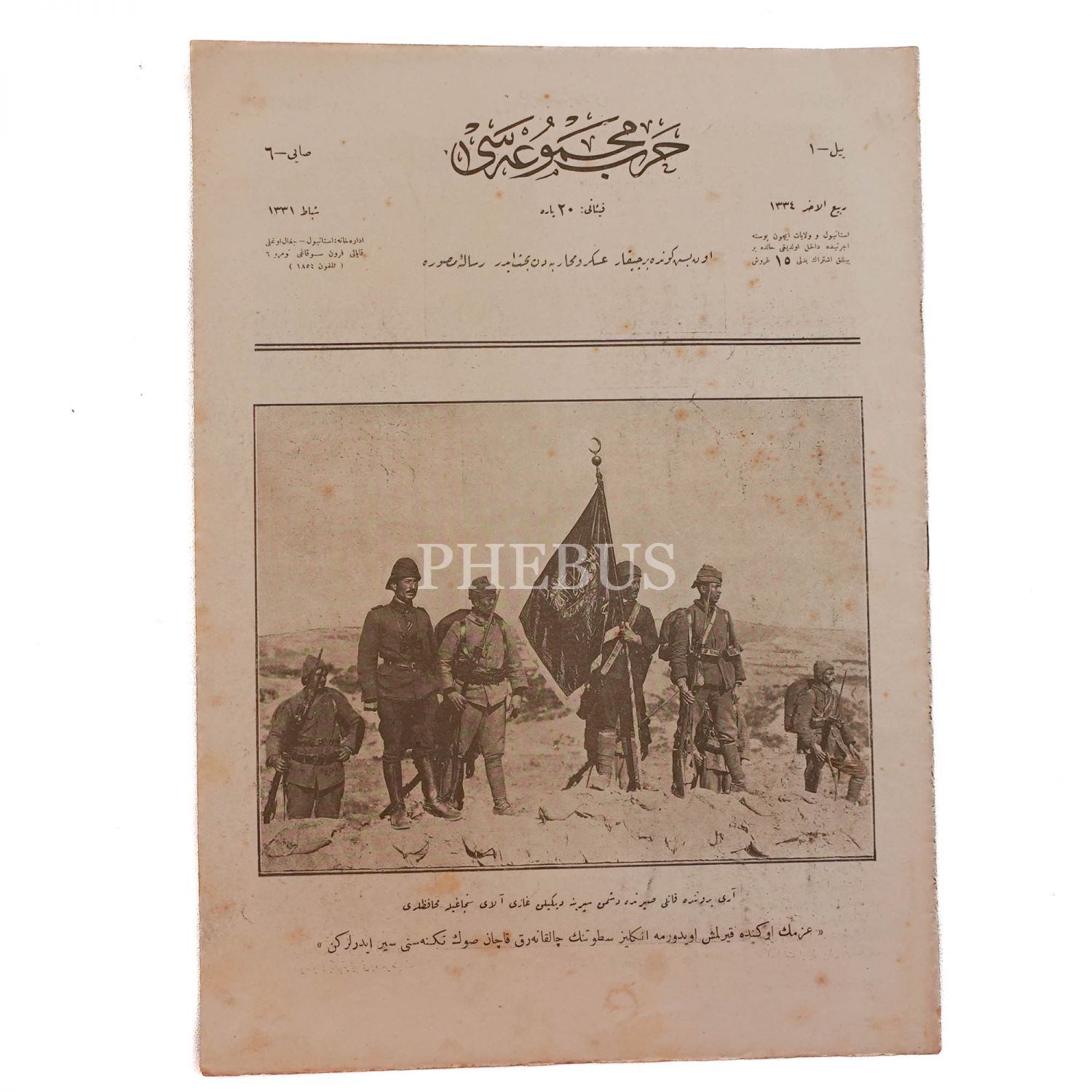 Rebiulahir 1334 tarihli mecmuanın kapak yazısı: "Arıburnu´nda Kanlısırt´ta düşman siperine dikilen gazi alay sancağıyla muhafızları. "