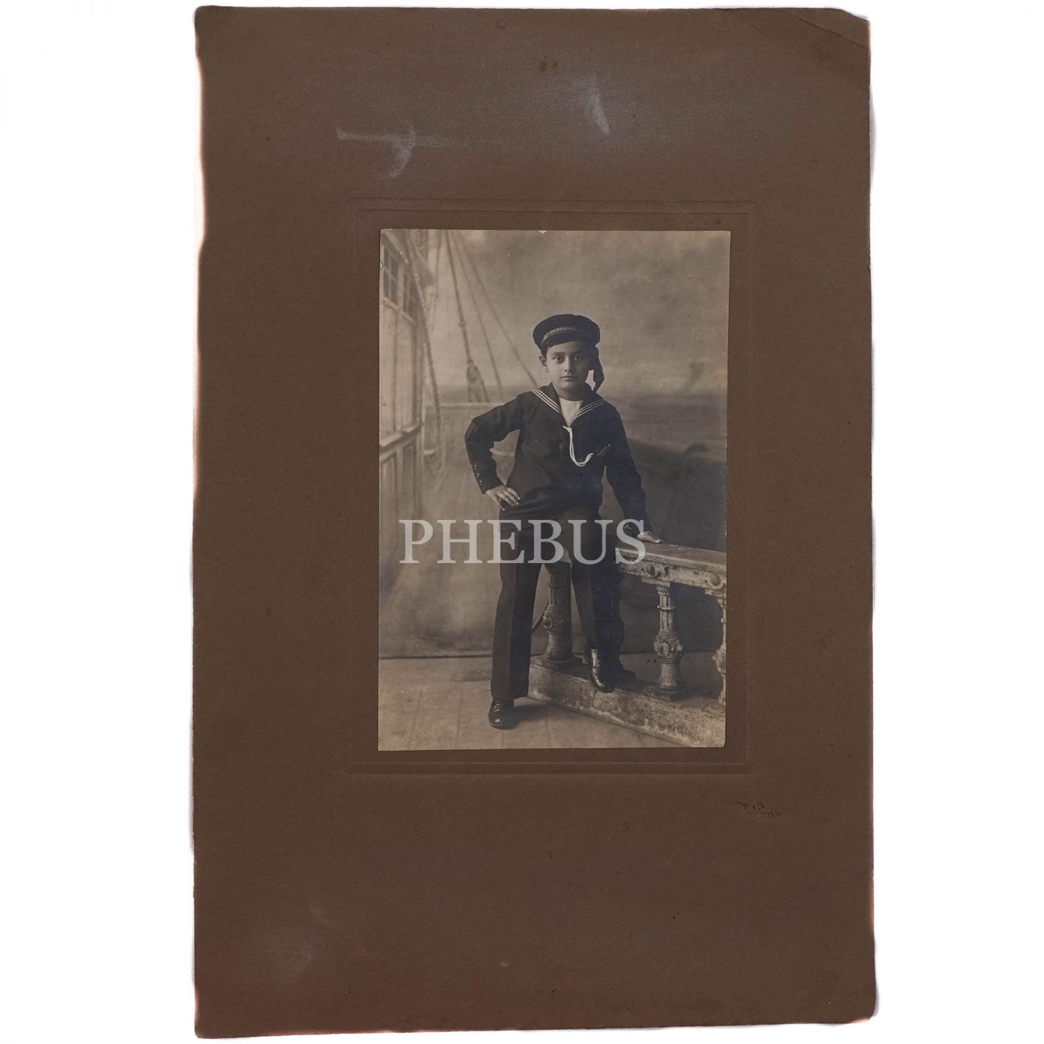 Şapkası "Dardanelles" (Çanakkale) yazılı denizci üniformasıyla poz veren bir çocuk, Phebus, Constantinople, fotoğraf 10x15 cm, paspartu 20x30 cm...