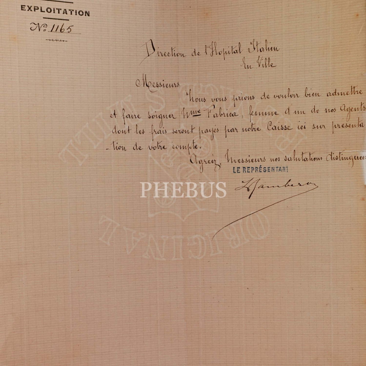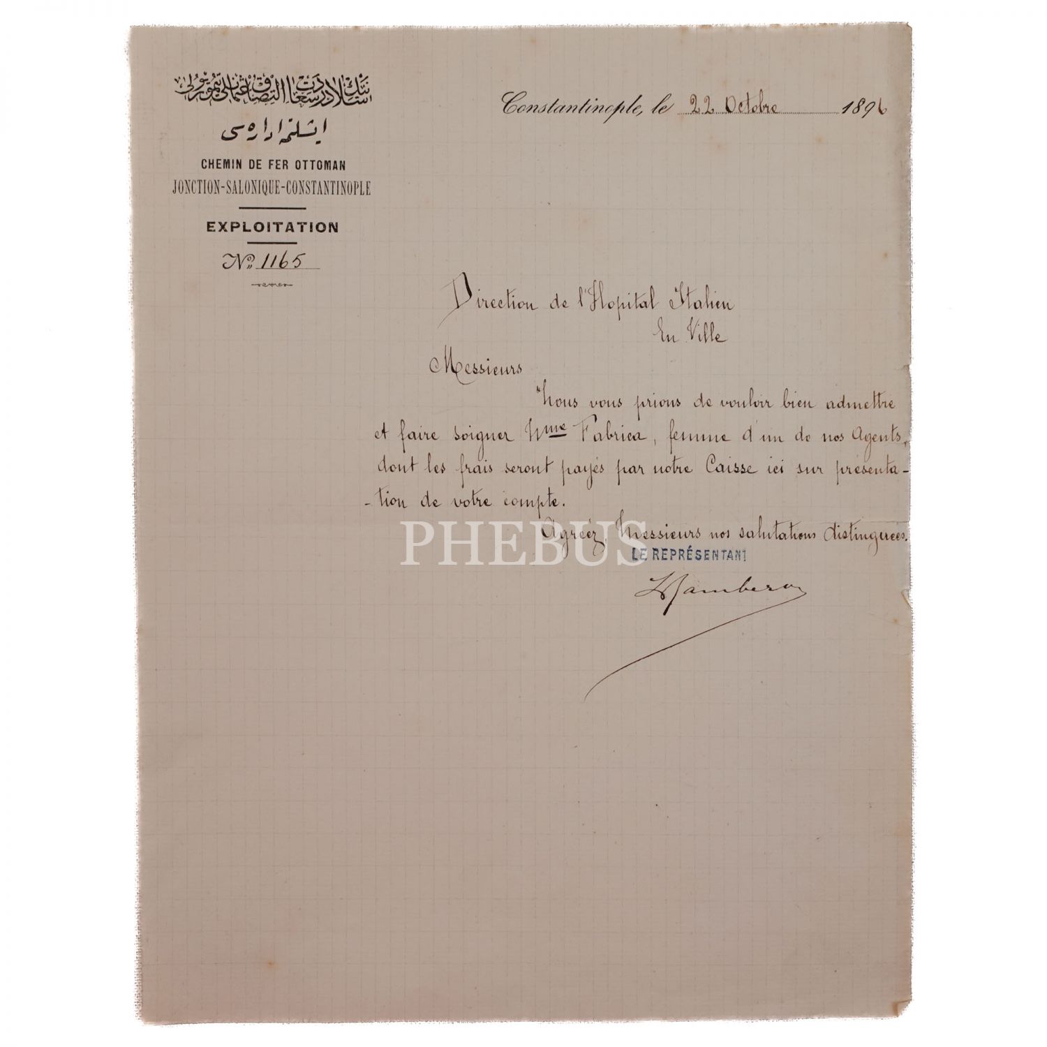 Osmanlıca-Fransızca "Selanik-Dersaadet İltisak Osmânlı Demiryolu İşletme İdaresi" antetli ve "Constantinople" ibareli, 22 Ekim 1896 tarihli Fransızca mektup...
