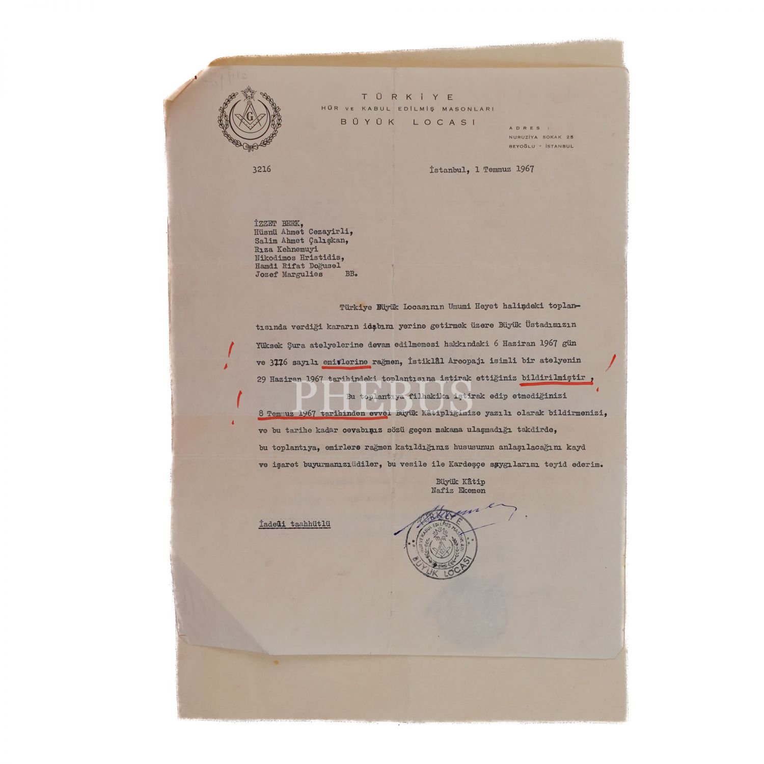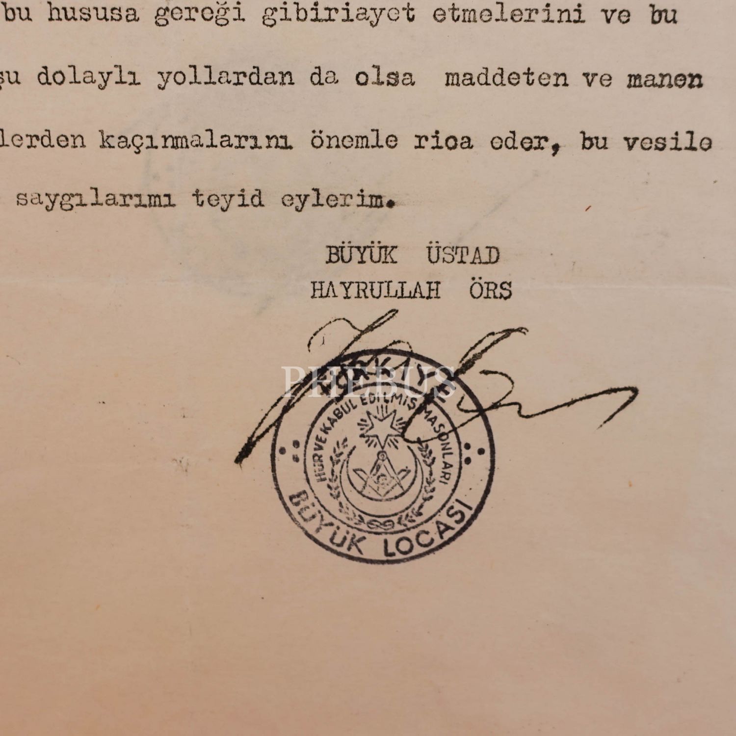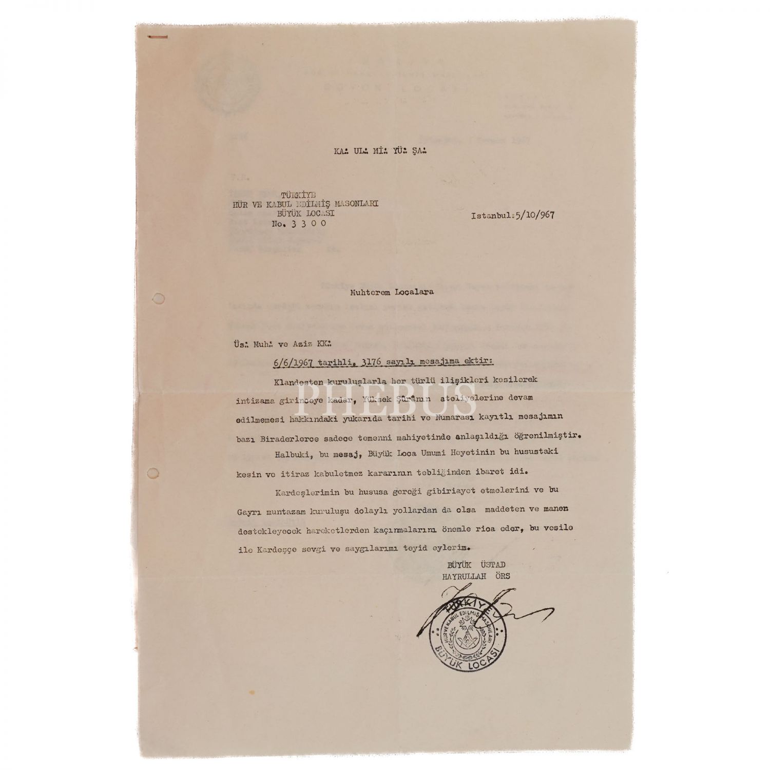 Türkiye Hür ve Kabul Edilmiş Masonları Büyük Locası Büyük Üstadı Hayrullah Örs´ün, üye kardeşlerine hitaben kaleme aldığı, intizamı bozan Yüksek Şûrâ´nın etkinliklerine iştirak edilmemesini rica ettiği mektup ile bu toplantılardan birine katılan 7 üyeye hitaben Büyük Kâtip Nafiz Ekemen tarafından kaleme alınan ve kendilerinden konuya ilişkin yazılı beyanat rica eden mektup, 1967, 23x33 cm - 23x29 cm...