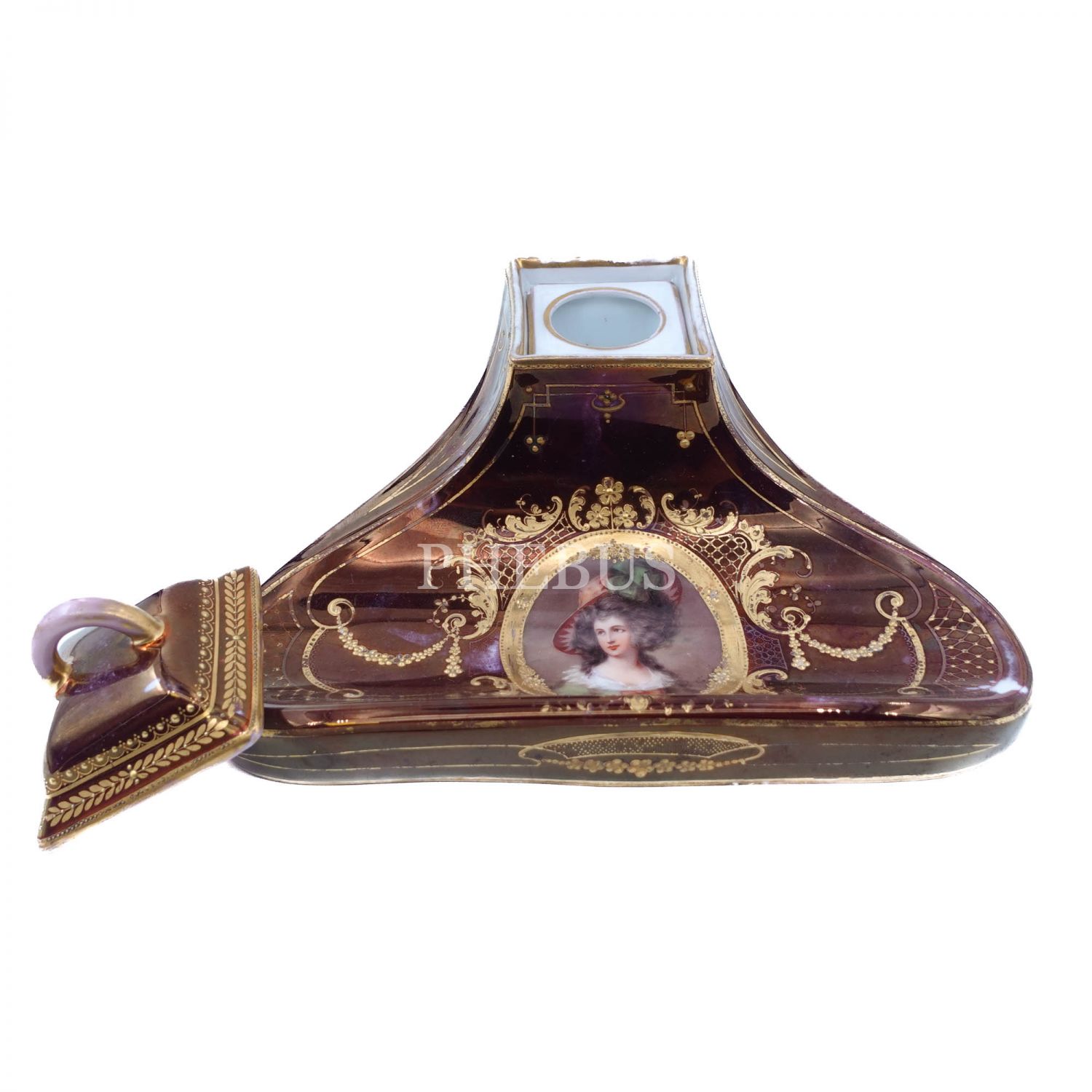 Lady Sheffield ve zarif bir yaprak damgalı, porselen üzeri altın vermeili, merkezinde damgada adı geçen Lady Sheffield´ın bir portresi olan, mürekkep hazneli, kalem için kaidesi bulunan hokka, 15x20 cm...