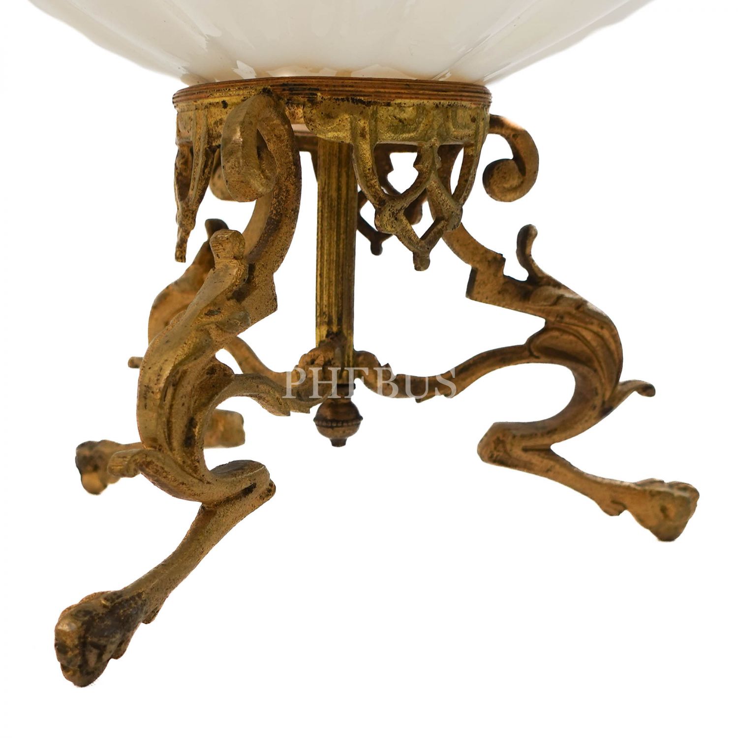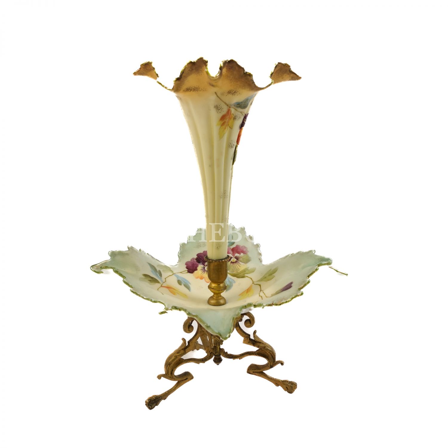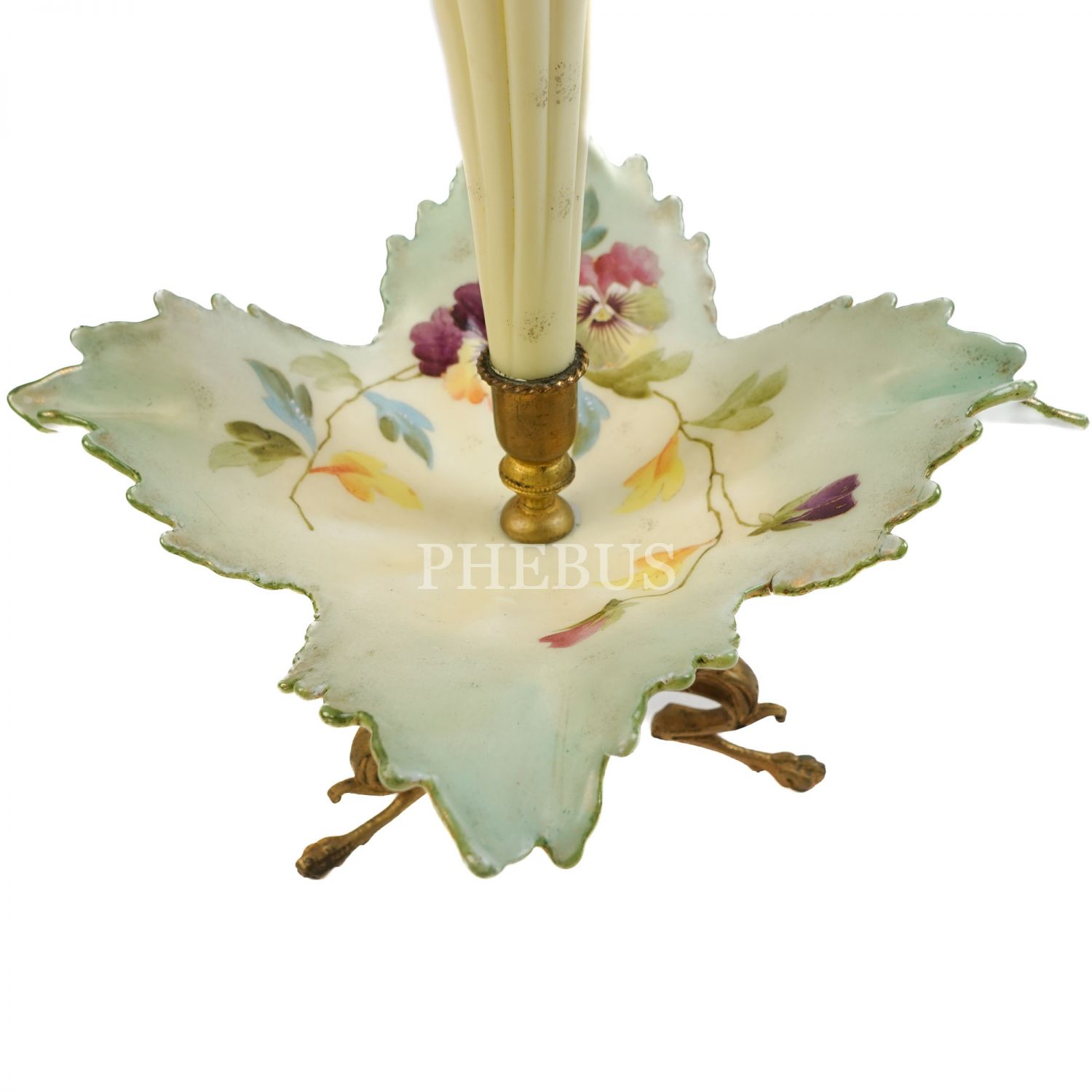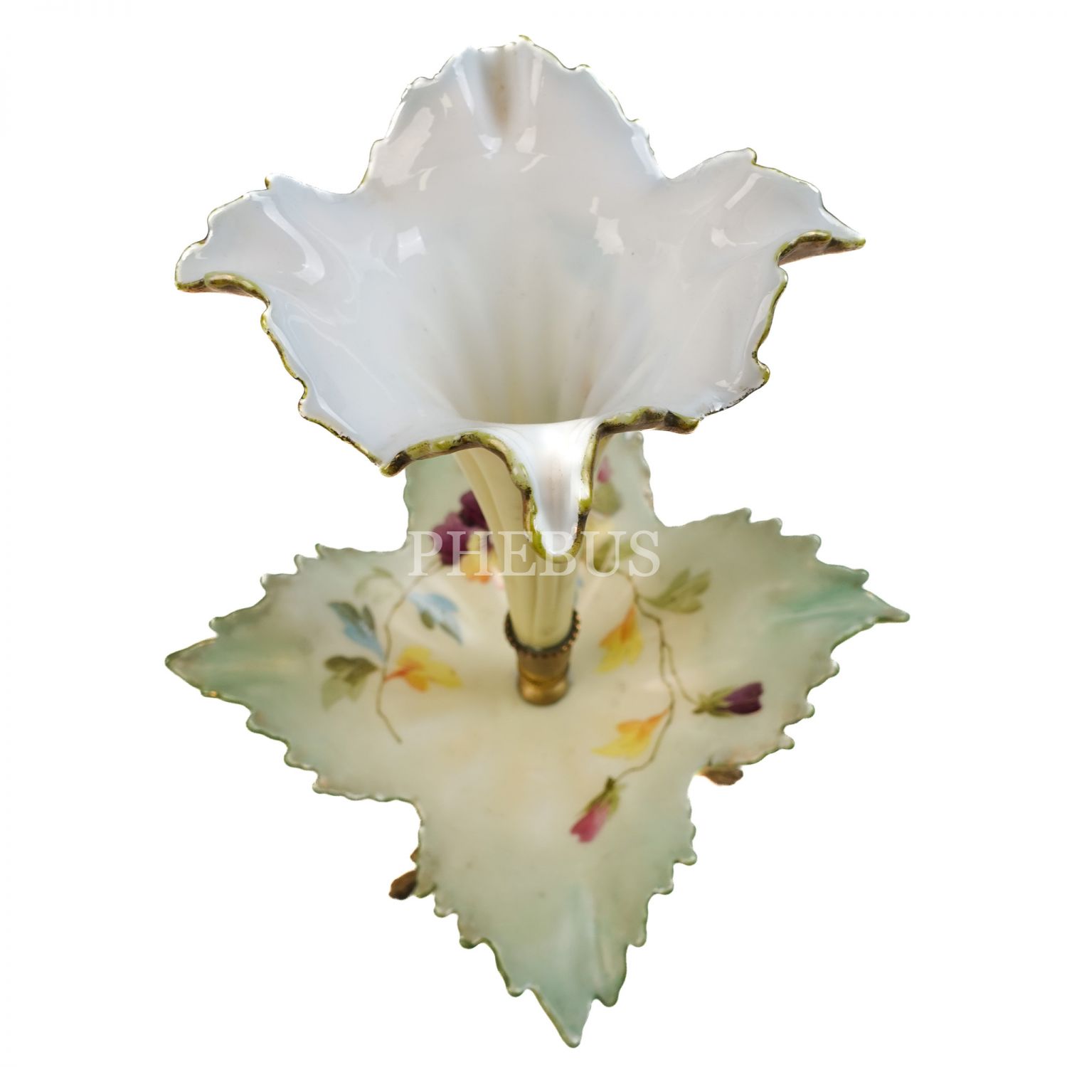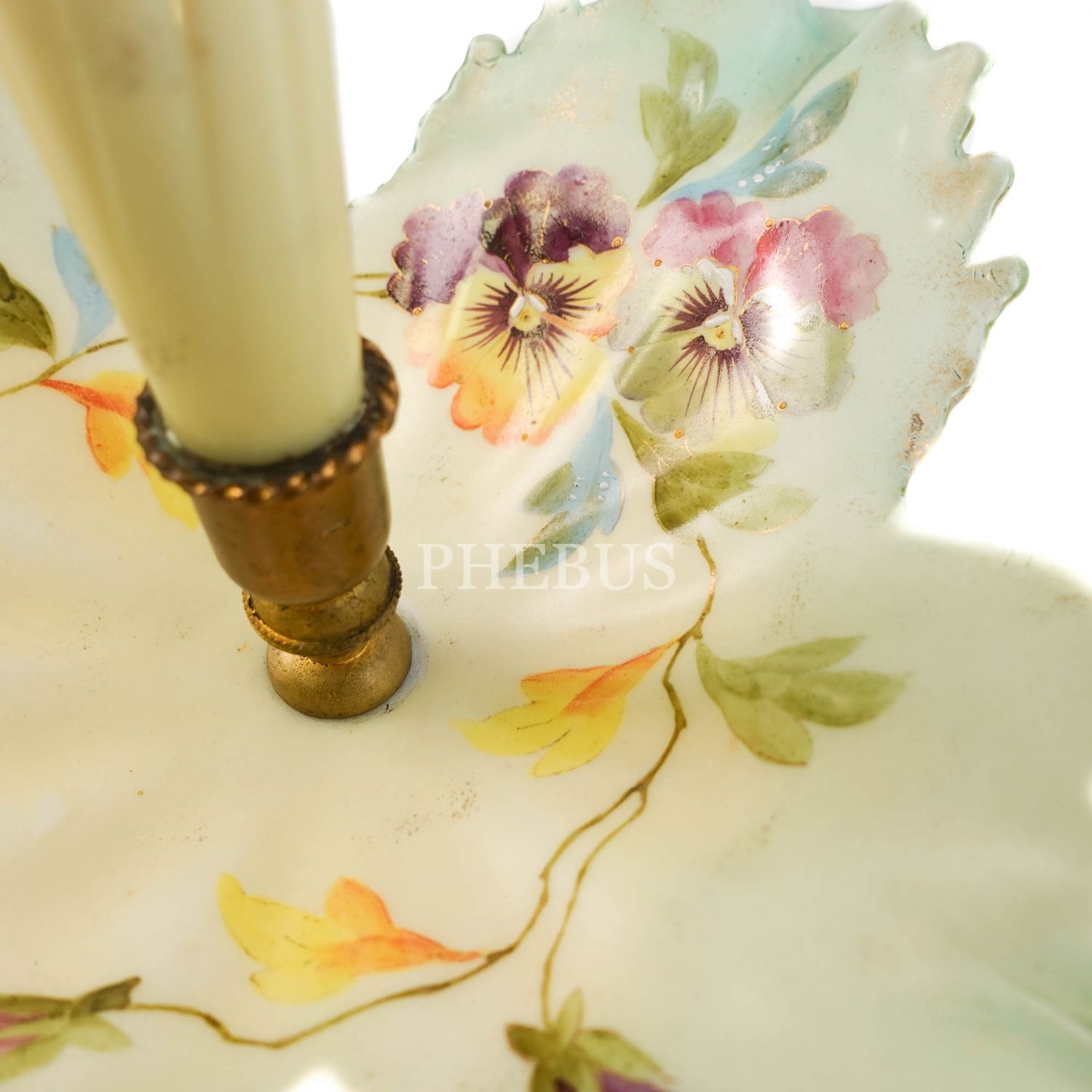 Pirinç ayaklı kaide üzerine beyaz opalinden yapılmış, tamamen el boyama, fıskiye formunda görsele sahip, menekşe işlemeli Fransız çiçeklik. 35x20cm