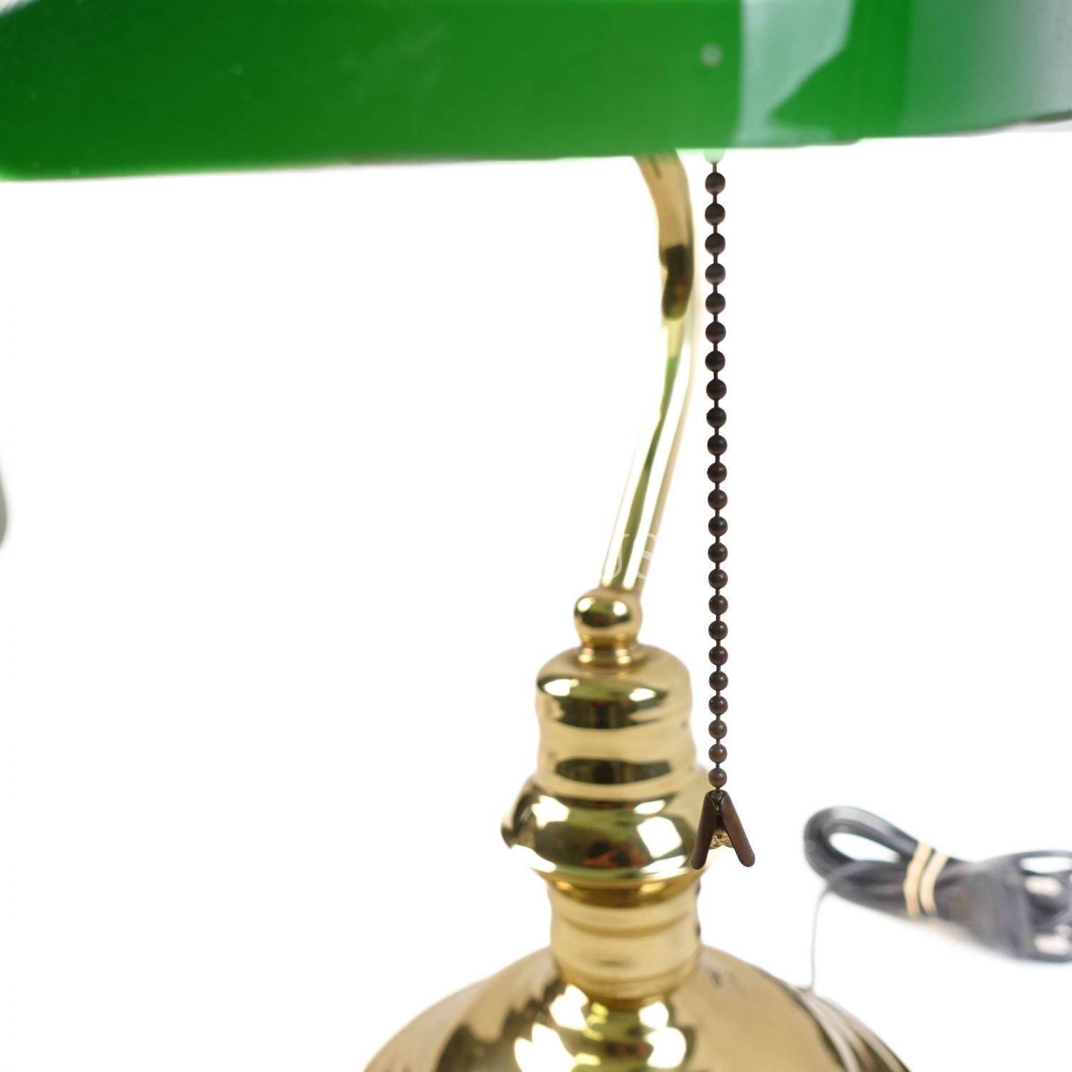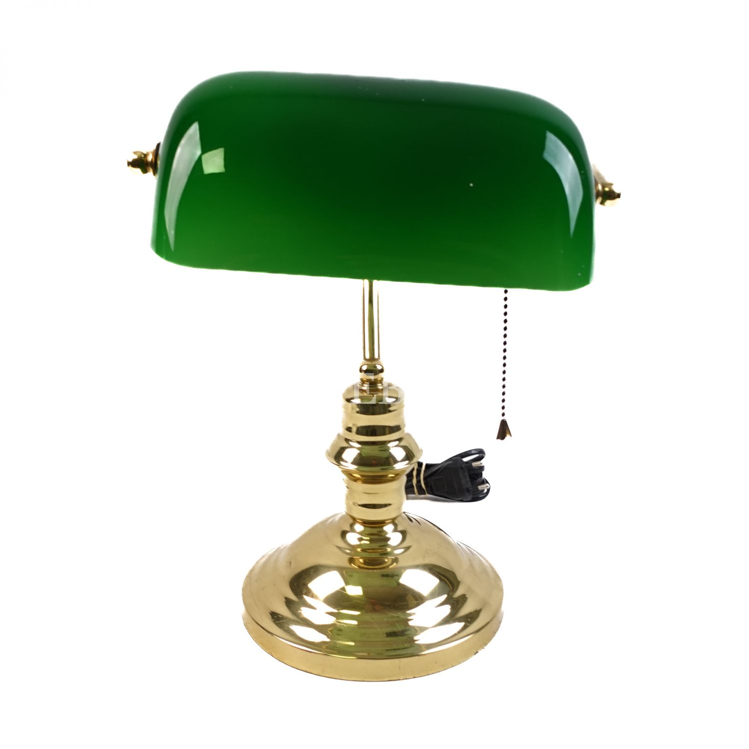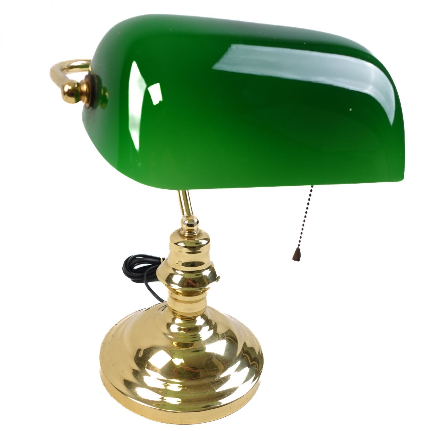 Banker tipi olarak da adlandırılan, pirinç yuvarlak kaide üzerine geniş yeşil cam şapkalı, çekme-bırakma zincir tertibatı ile çalışan masa lambası, 26x36 cm...