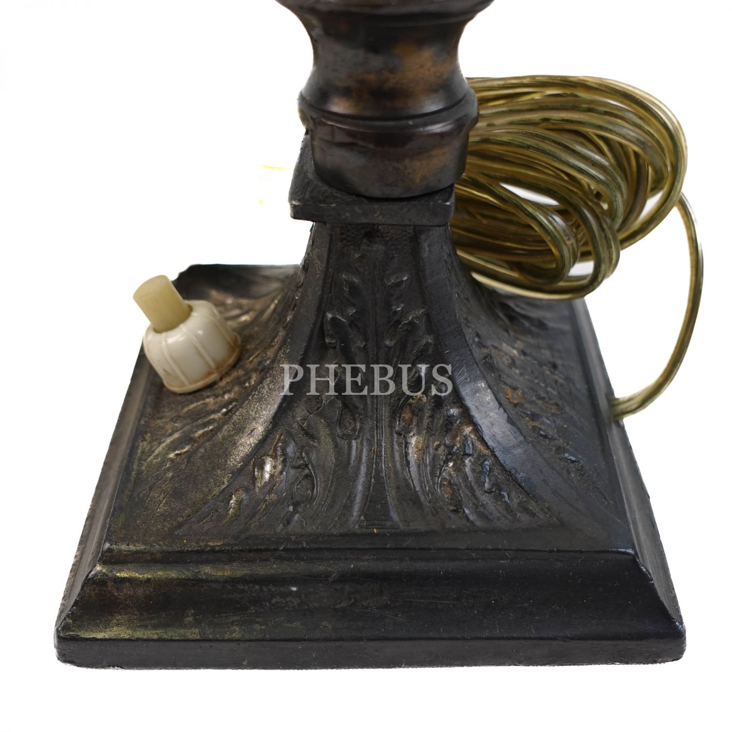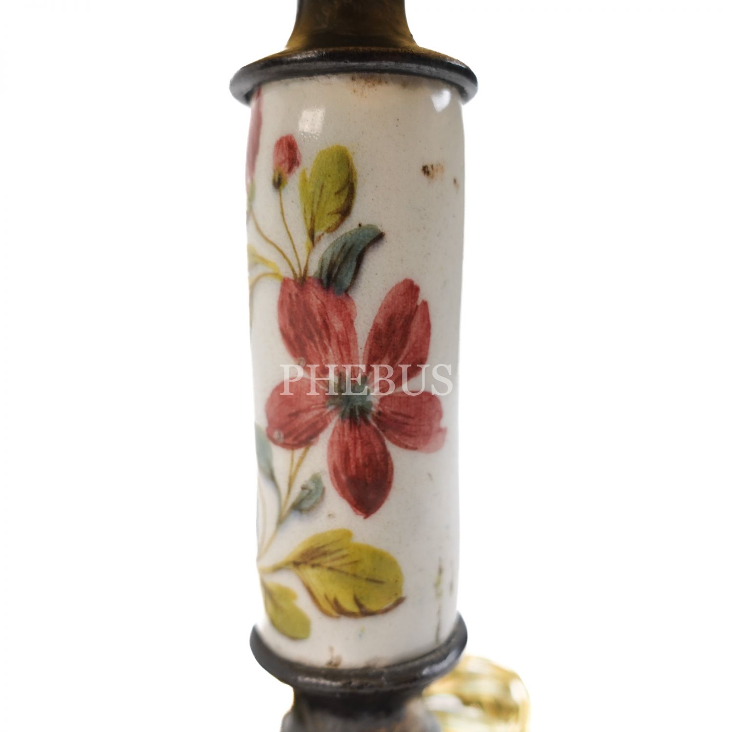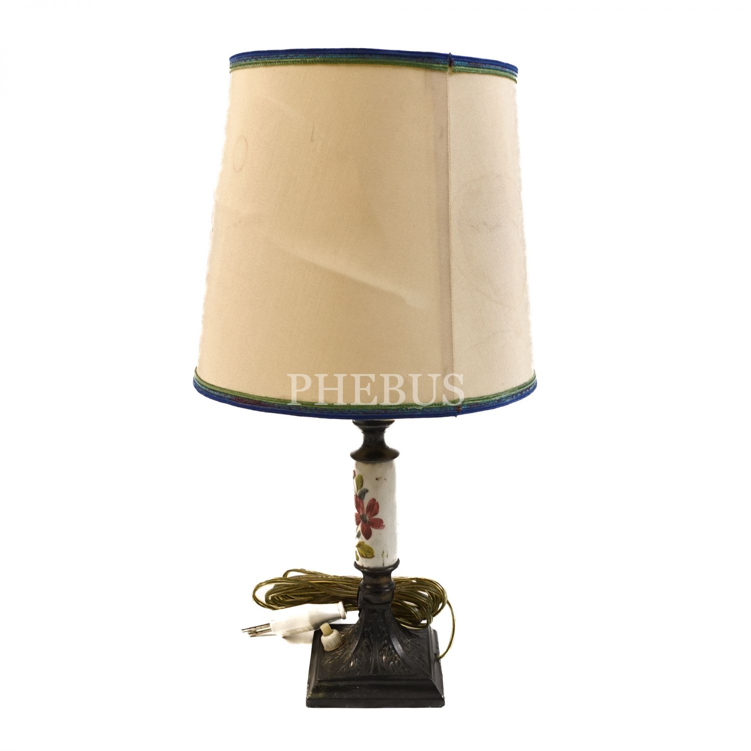Şapka kısmı ipek giydirmeli, kaide ve şapkaya uzanan bölümü bronz, orta kısmı el boyama porselenden çiçek işlemeli, kaide üzeri düğme ile açılıp kapanan etajer üzeri abajur, 36x20 cm...