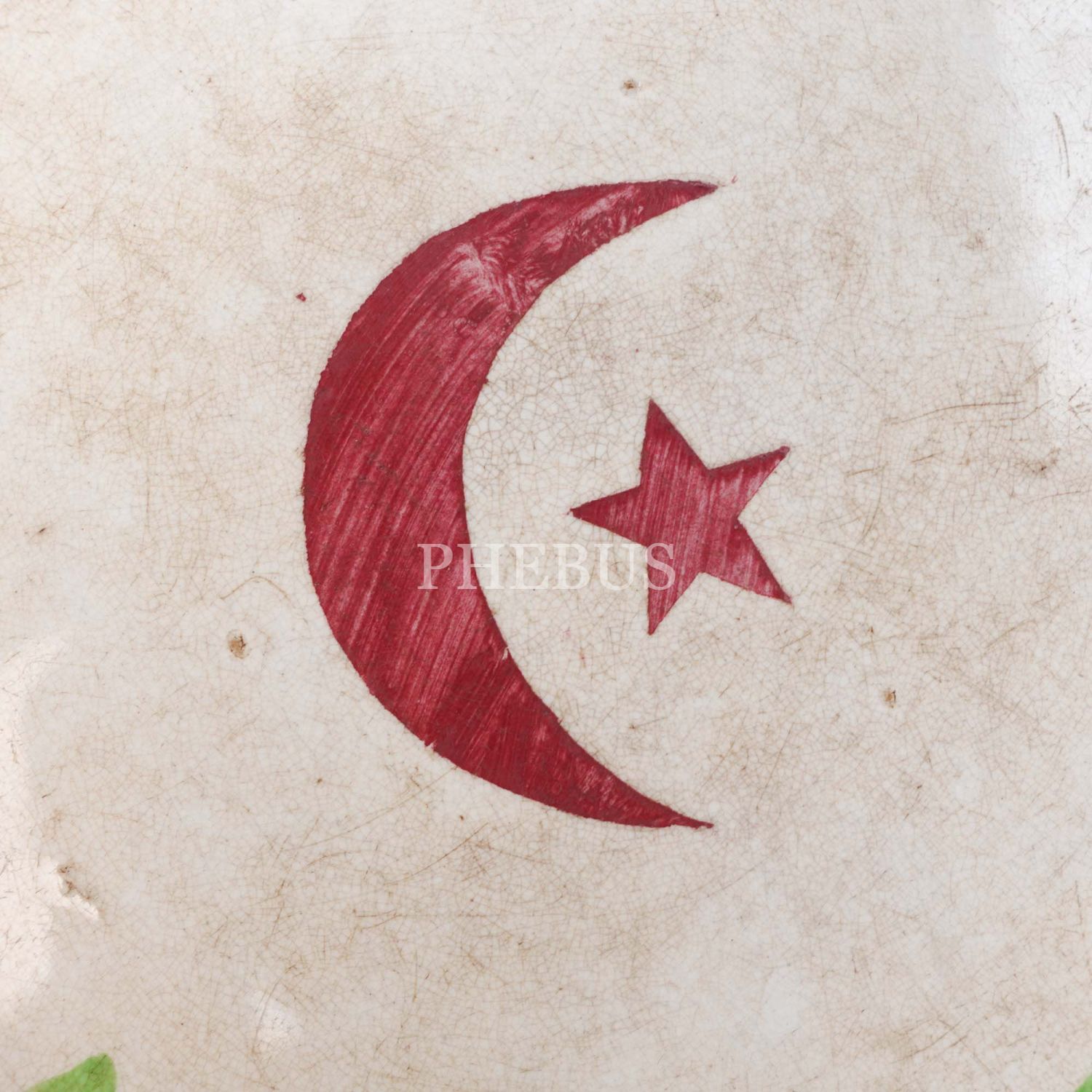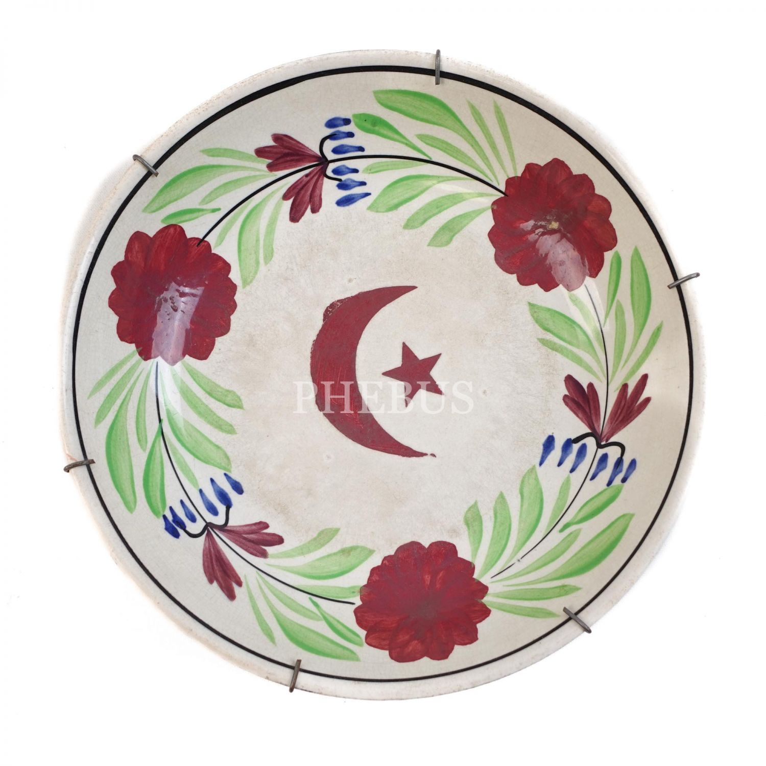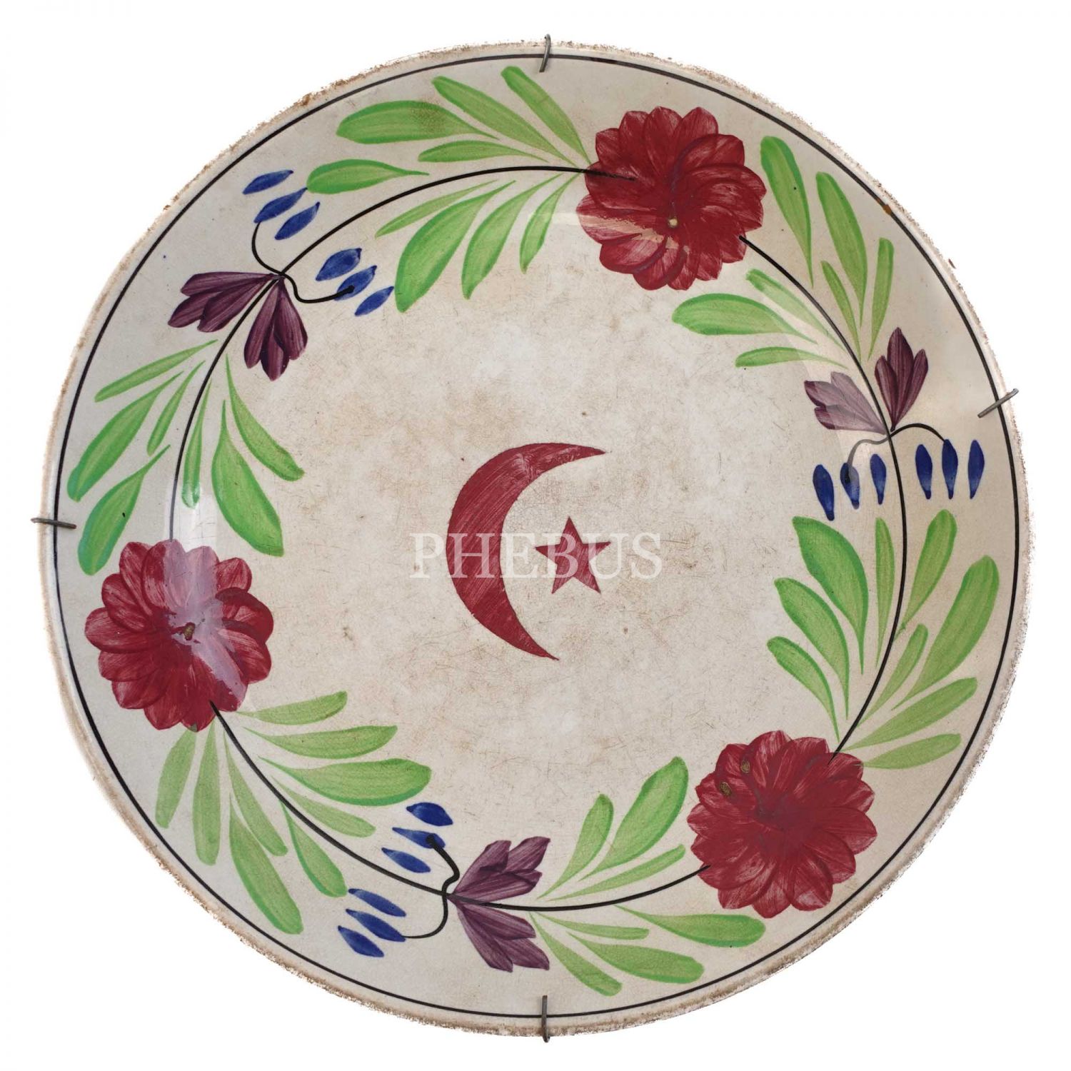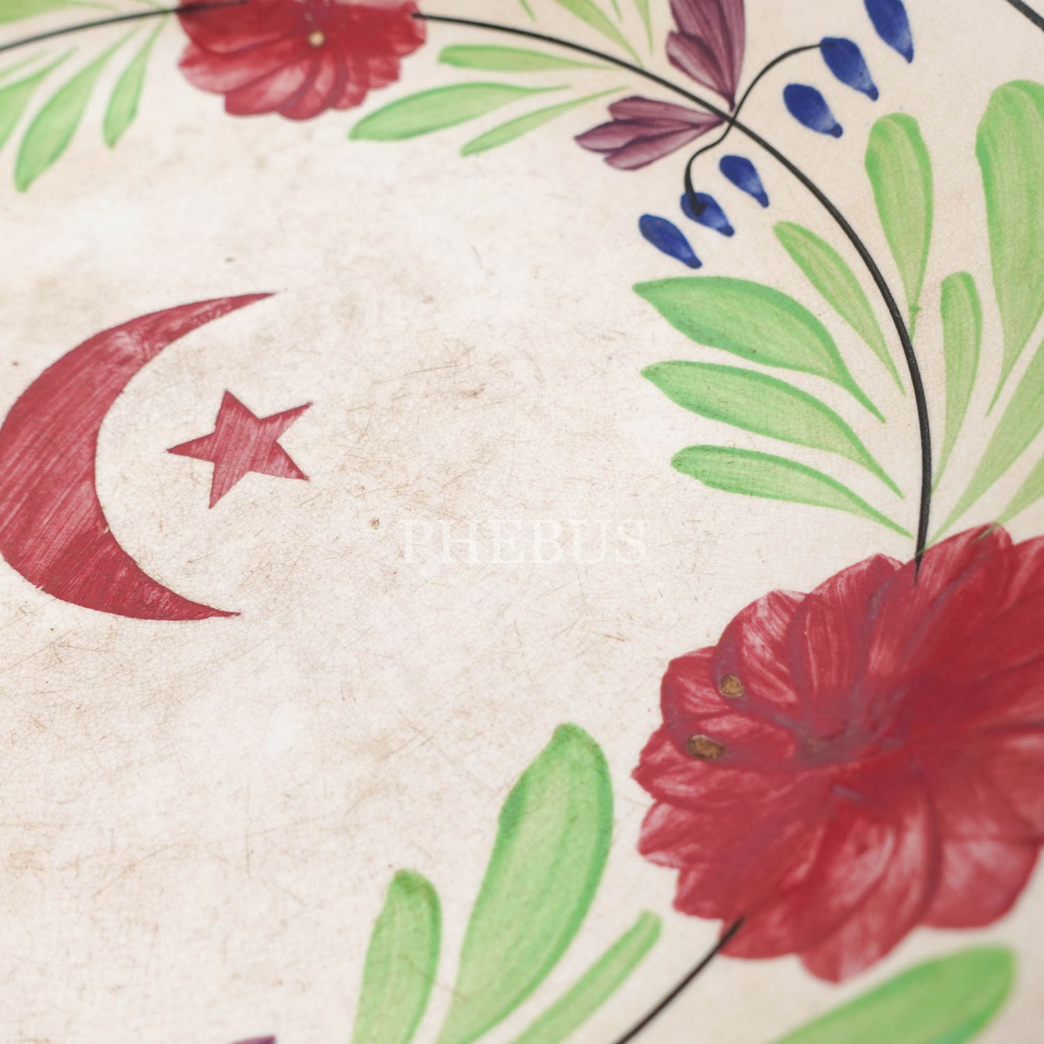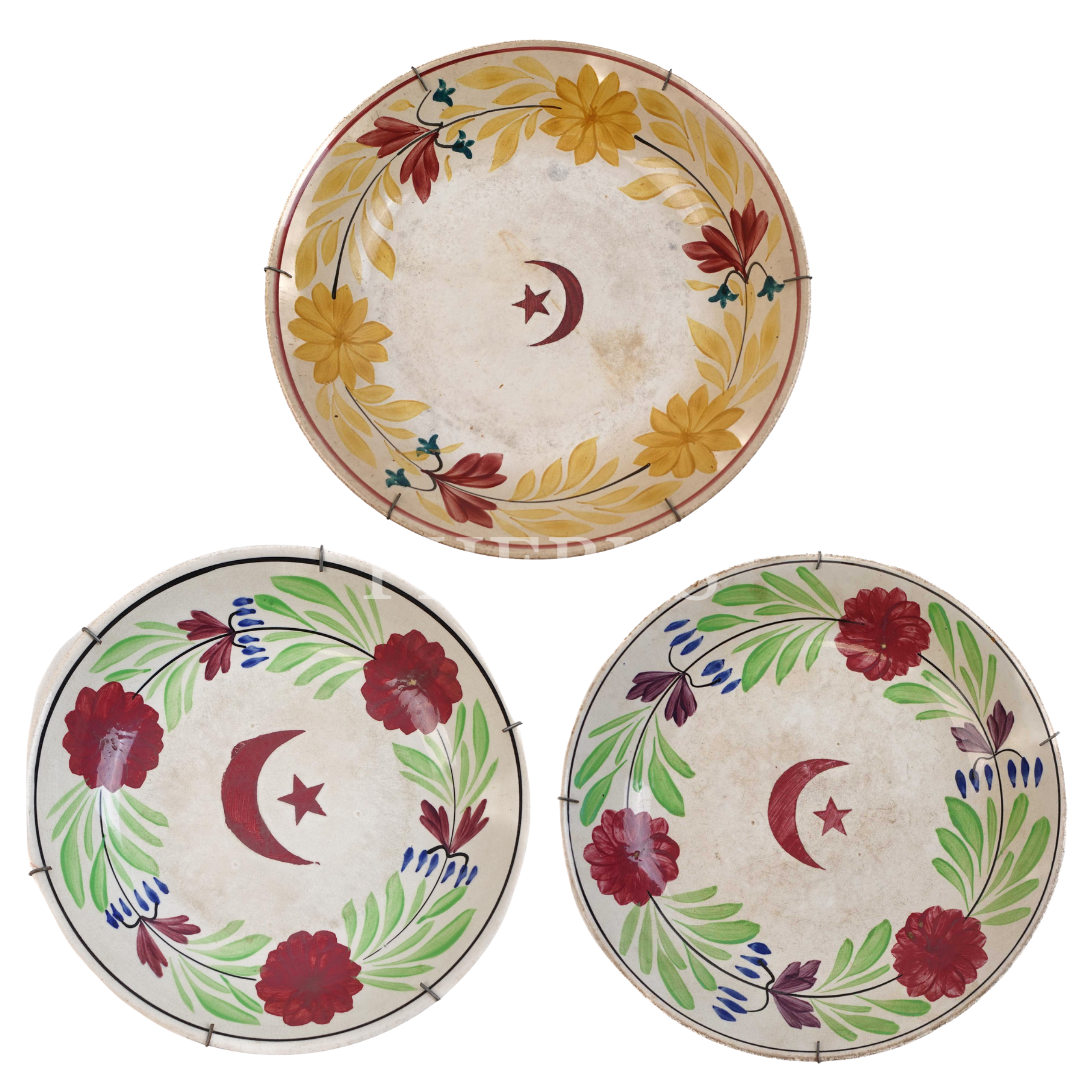 Hollanda merkezli bir firma tarafında Osmanlı pazarı için üretilen, iç kısmı tamamen el boyama çiçek desenli ve orta kısmı kırmızı ay-yıldızlı üç adet duvar tabağı, ortalama 26 cm...