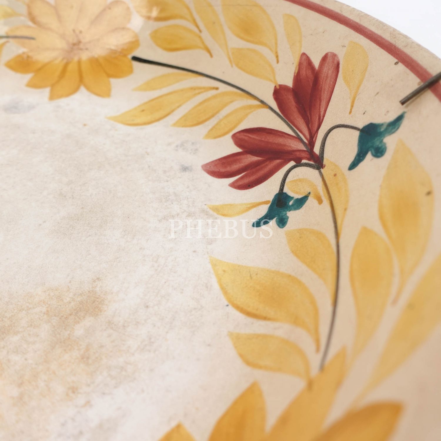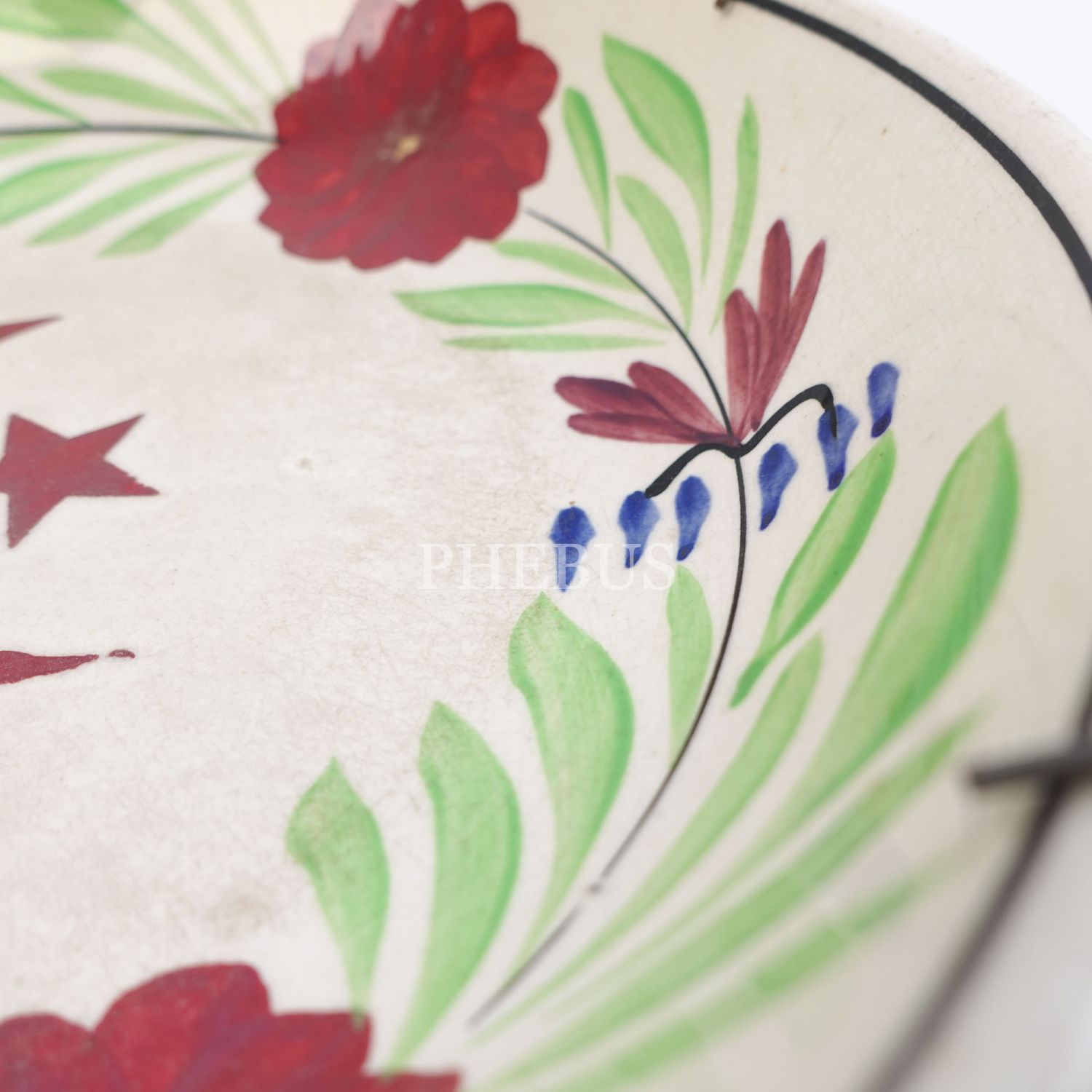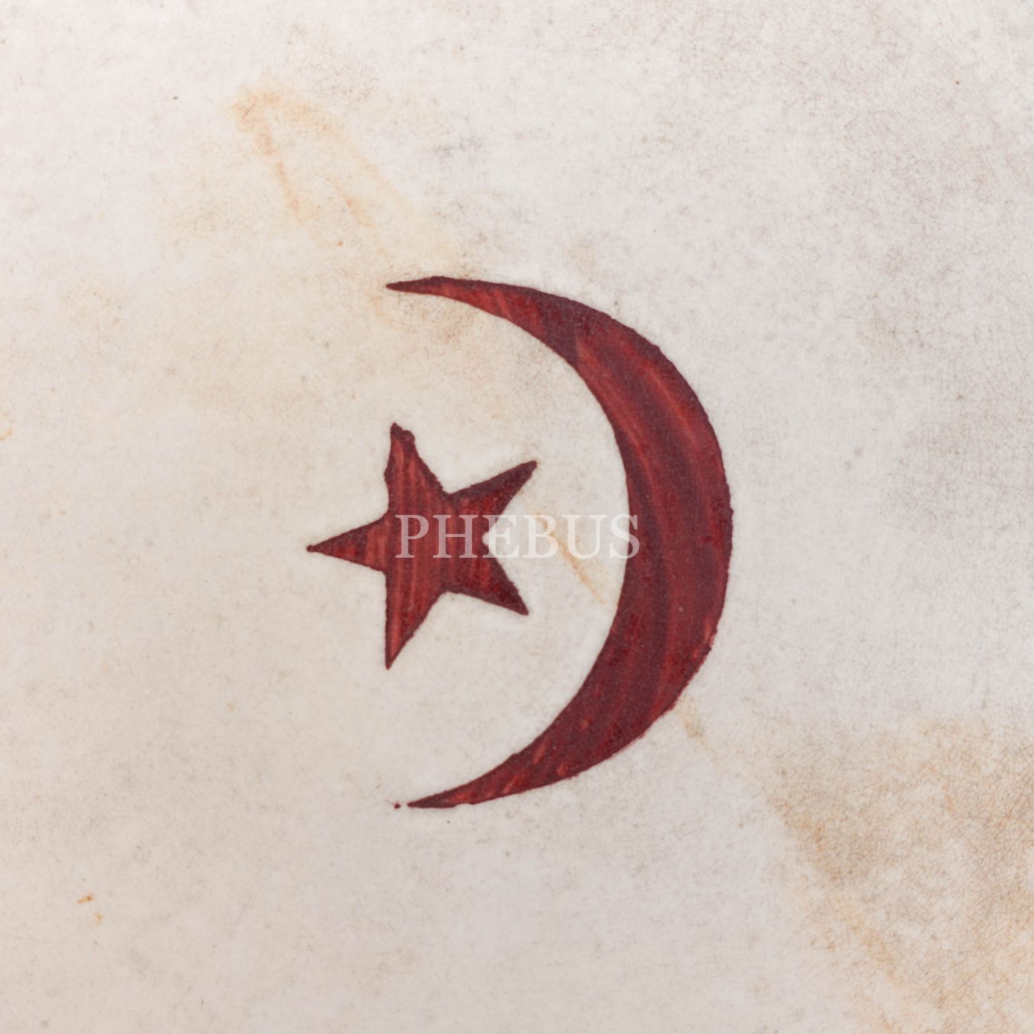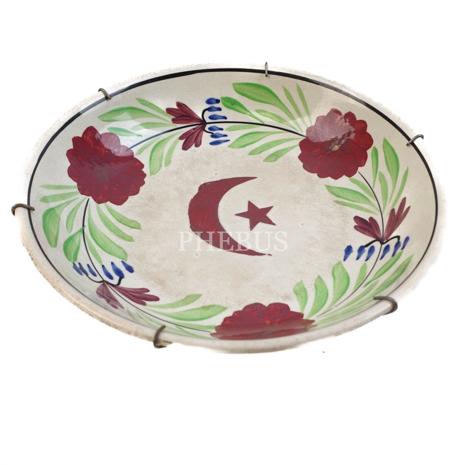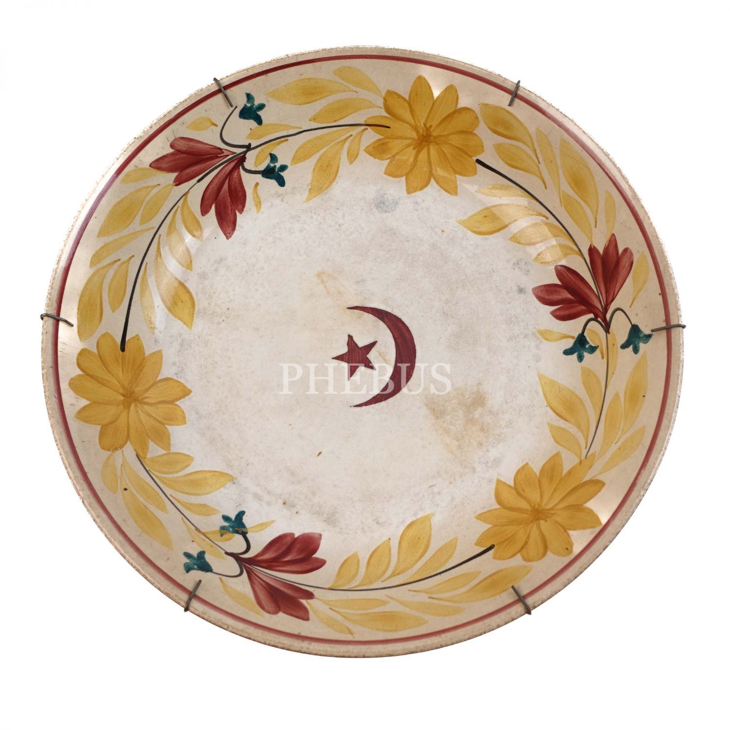 Hollanda merkezli bir firma tarafında Osmanlı pazarı için üretilen, iç kısmı tamamen el boyama çiçek desenli ve orta kısmı kırmızı ay-yıldızlı üç adet duvar tabağı, ortalama 26 cm...