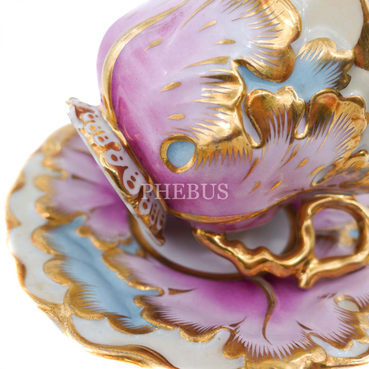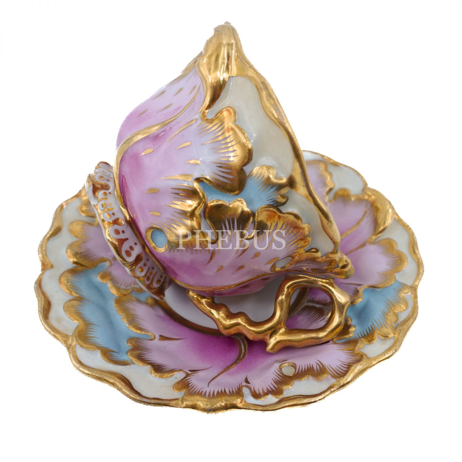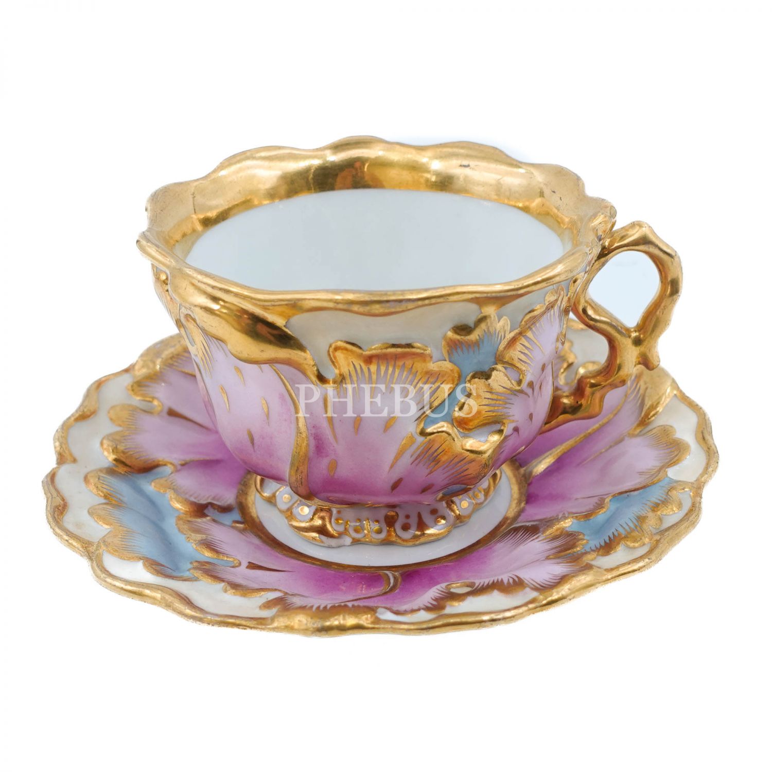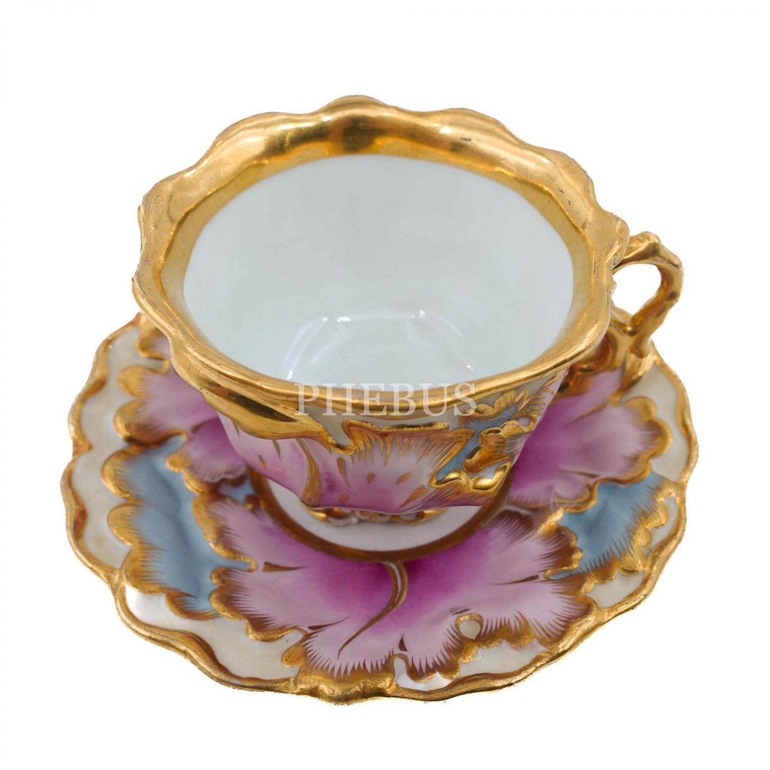 1800´lü yılların ortalarından, pembe ağırlıklı altın vermeili ve dolu dolu rölyefli Çek menşeili fincan ve tabağı, 8x15 cm...