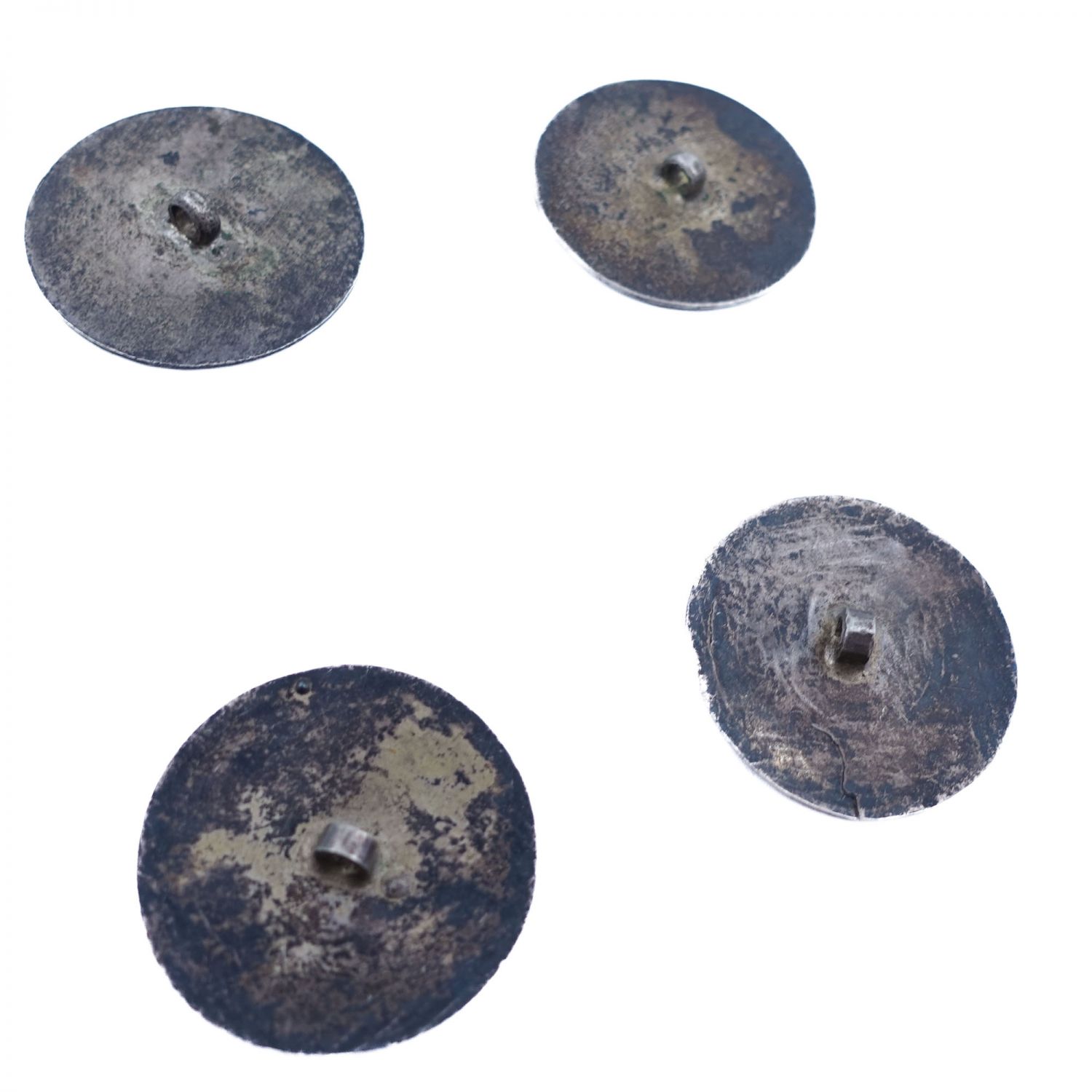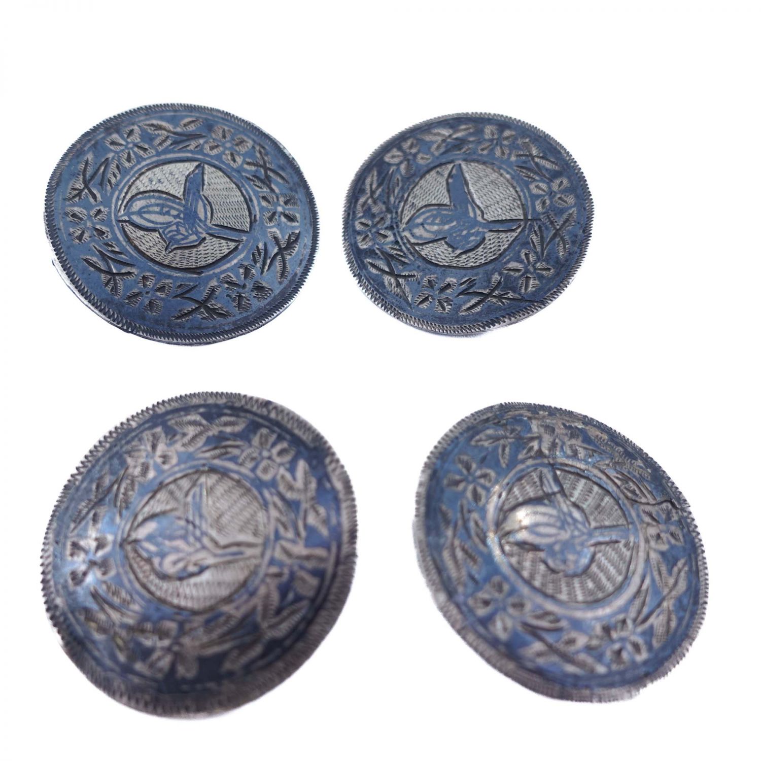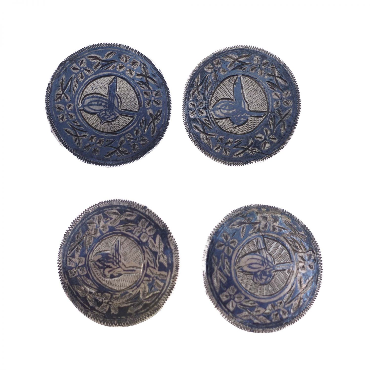 Dört adet savatlı gümüş düğme, her biri kalem işçilikli tuğra motiflidir, 18 gr, 3 cm...