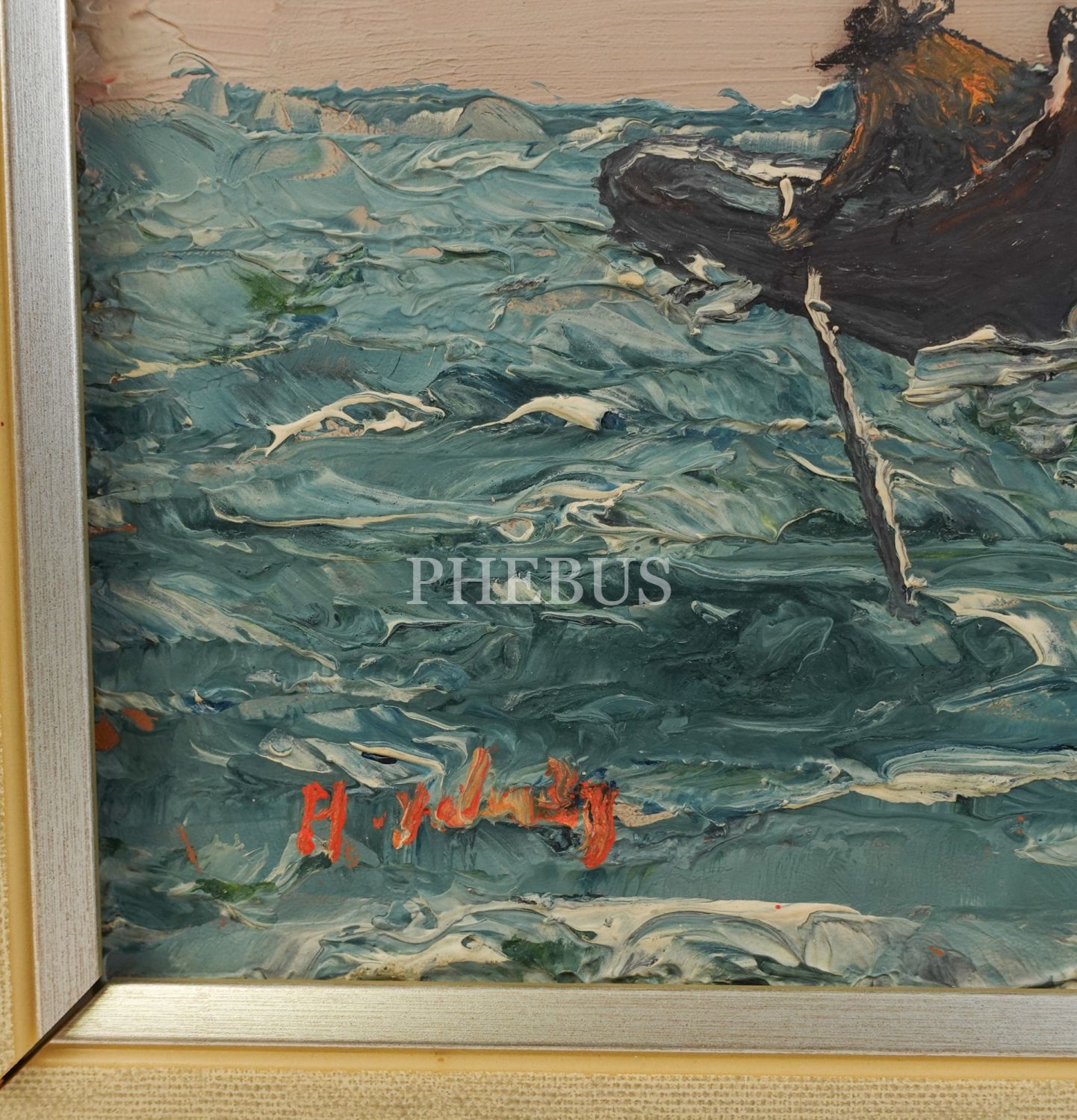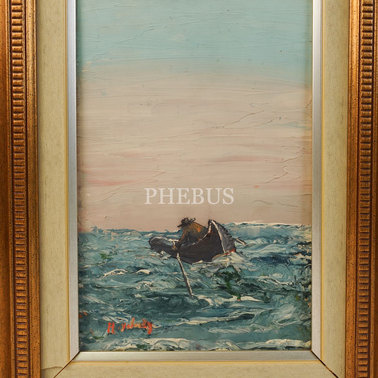 Sanatçı imzalı, duralit üzeri yağlıboya, denizin ortasında kayıkçı temalı çerçeveli resim, 50x40 cm...