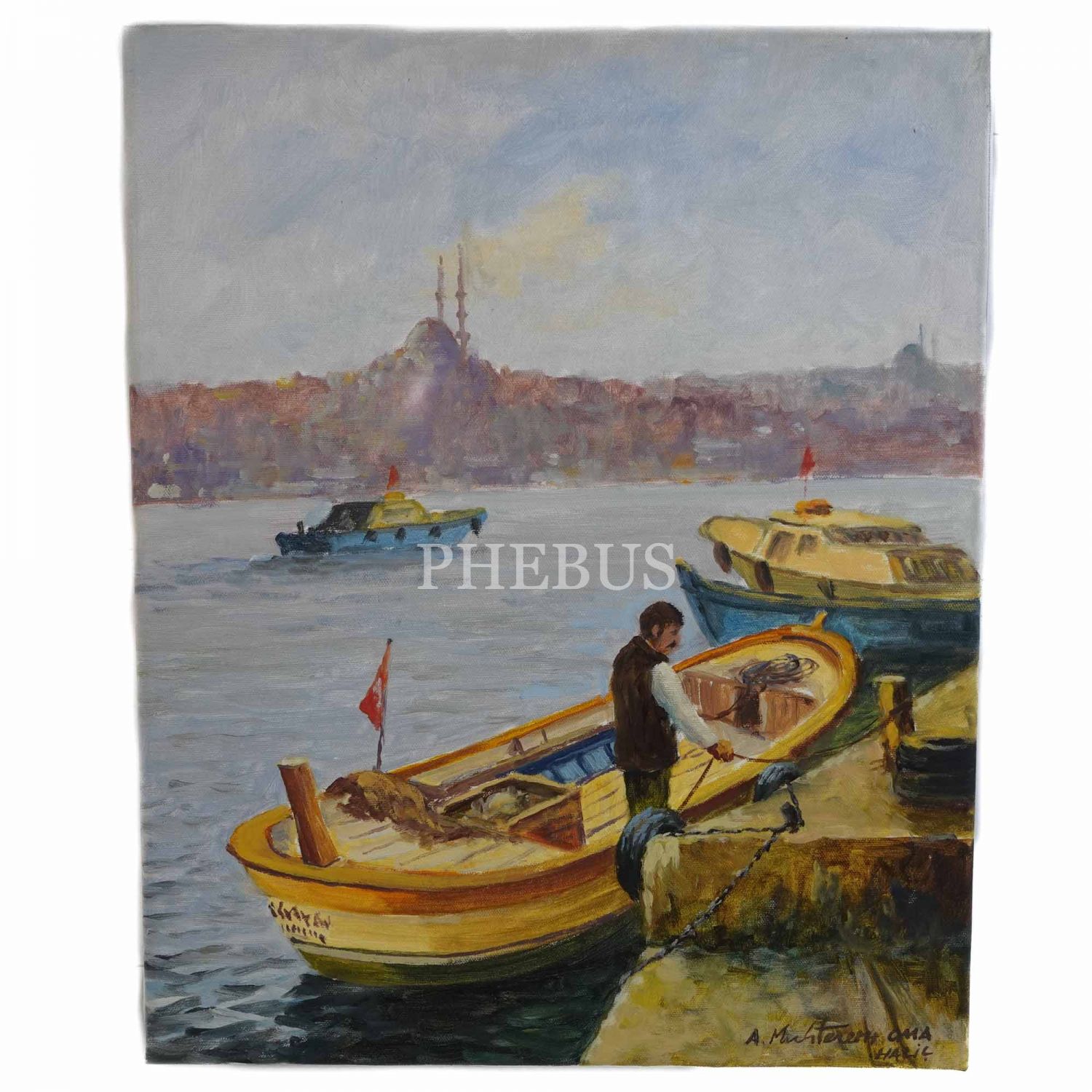 Ahmet Muhterem Oma imzalı, "Haliç" başlıklı, tuval üzeri yağlıboya resim, 40x50 cm...