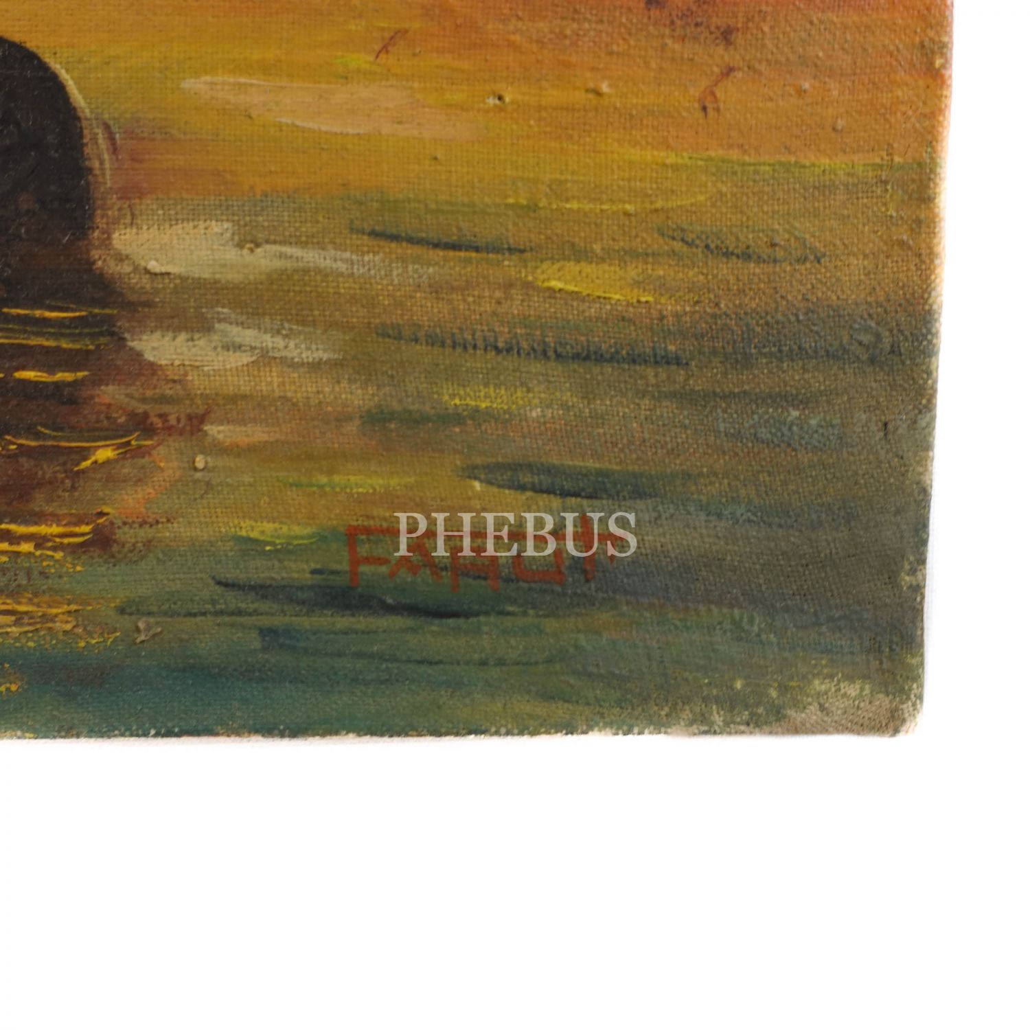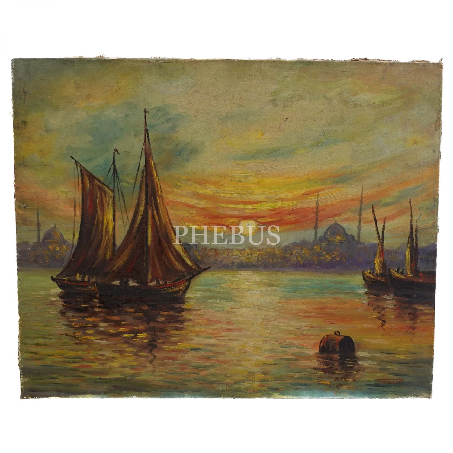 Ressam ve karikatürist Faruk Alpkurt´un fırçasından, Faruk imzalı, tuval üzerine yağlıboya İstanbul ve yelkenliler temalı resim, 40x50 cm...