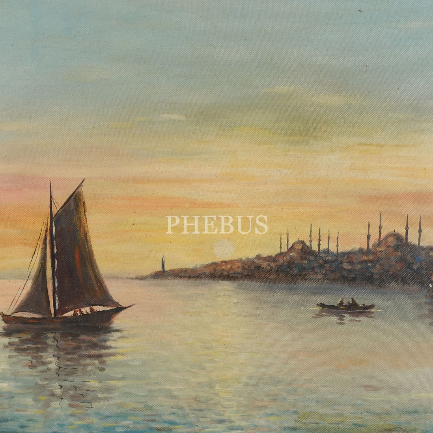 Ressam ve karikatürist Faruk Alpkurt´un fırçasından, Faruk imzalı, tuval üzerine yağlıboya denizden İstanbul manzarası temalı resim, 45x65 cm...