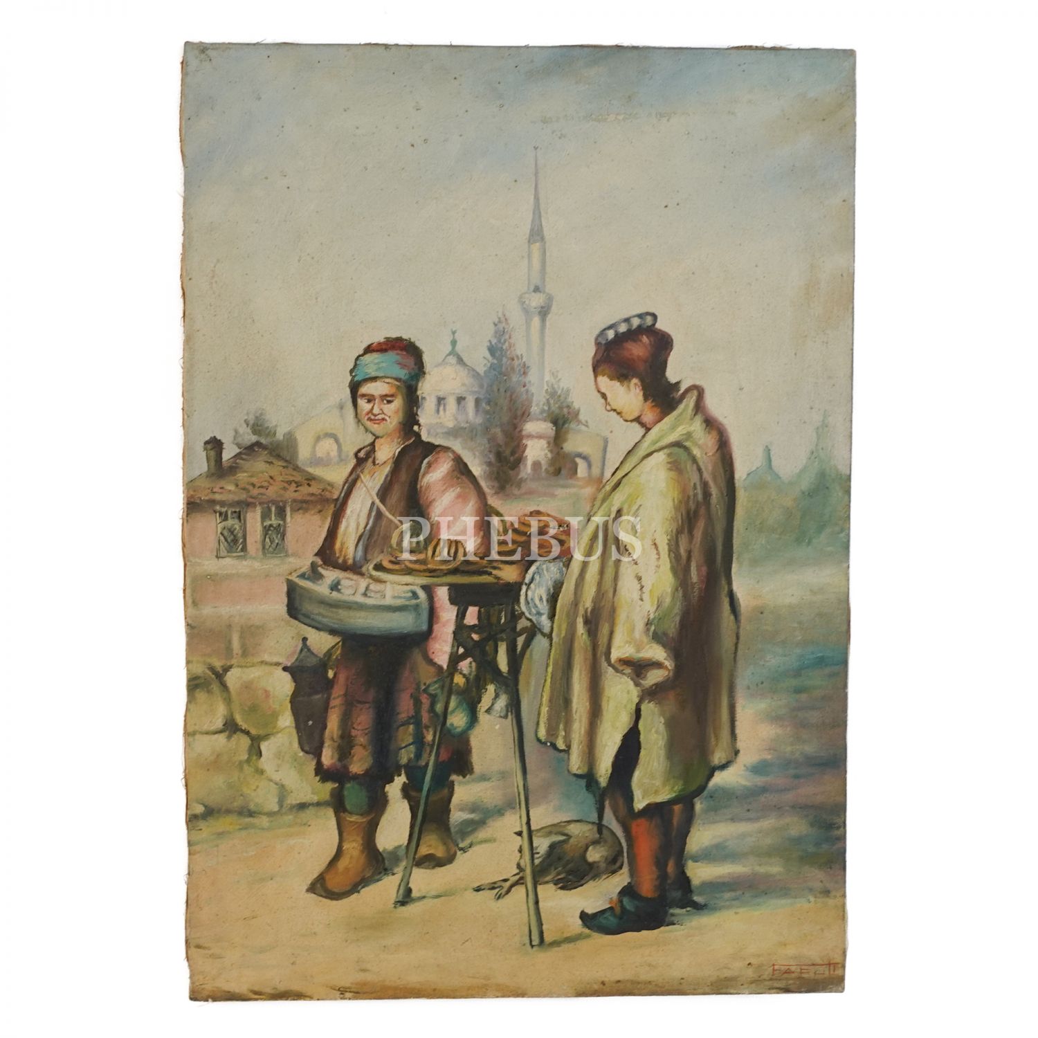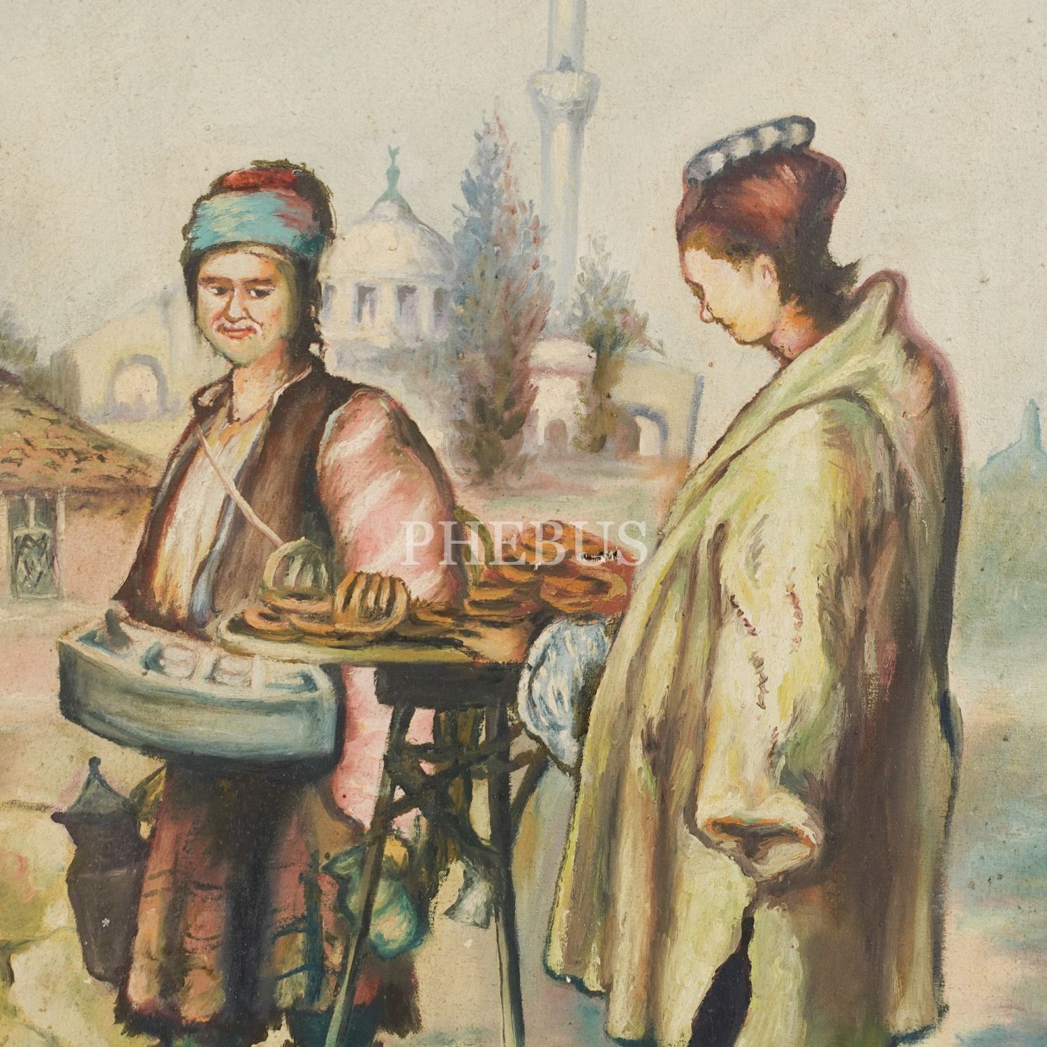 Ressam ve karikatürist Faruk Alpkurt´un fırçasından, Faruk imzalı, tuval üzerine yağlıboya İstanbul´da simitçi ve su satan genç temalı resim, 45x65 cm...