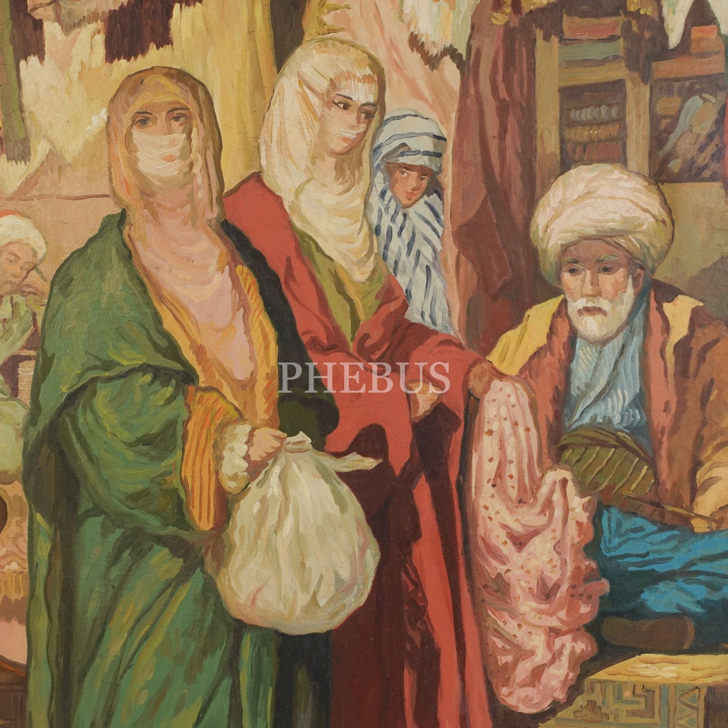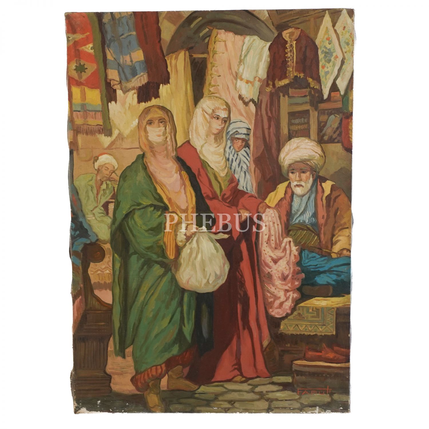 Ressam ve karikatürist Faruk Alpkurt´un fırçasından, Faruk imzalı, tuval üzerine yağlıboya kumaş bakan Osmanlı kadınları temalı resim, 45x65 cm...