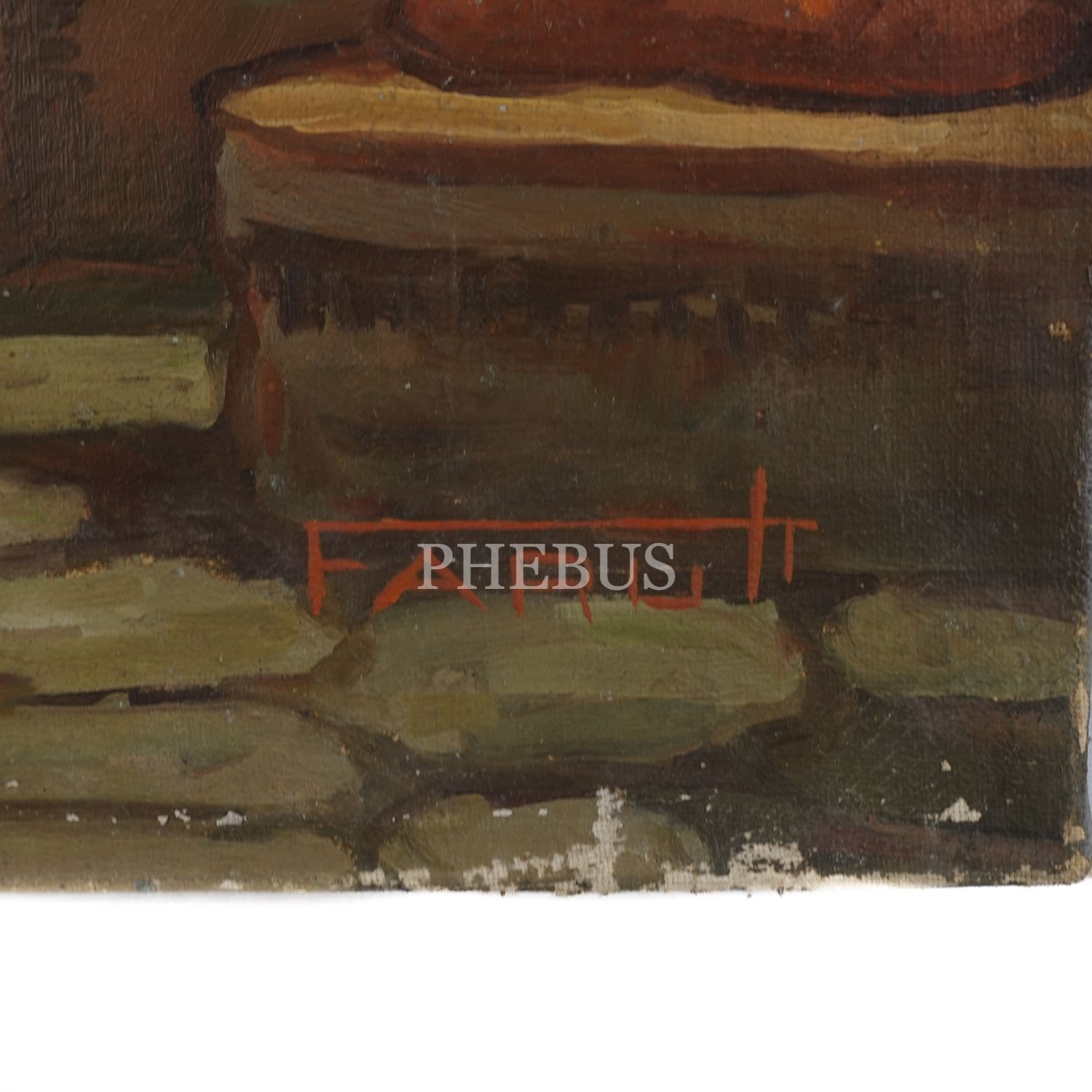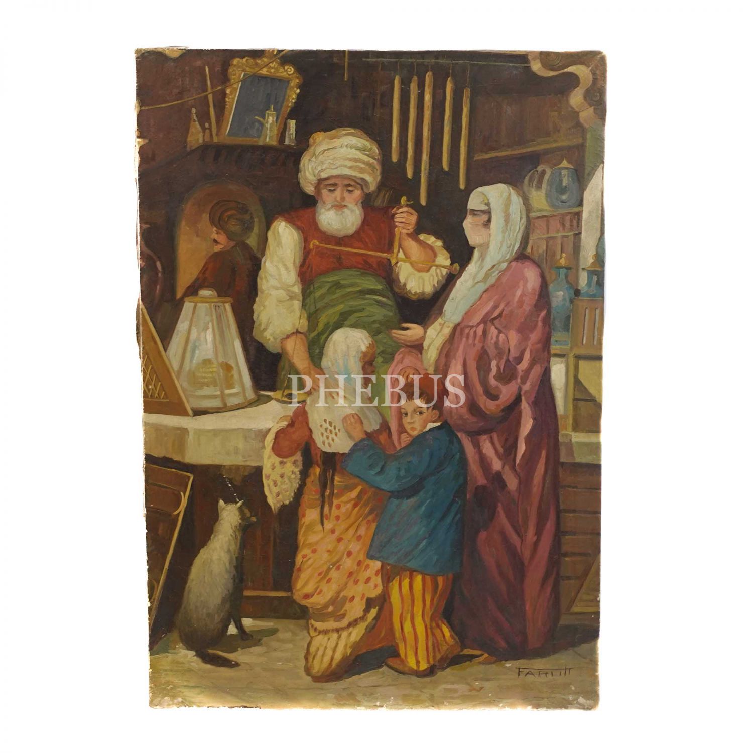 Ressam ve karikatürist Faruk Alpkurt´un fırçasından, Faruk imzalı, tuval üzerine yağlıboya alışveriş yapan Osmanlı kadınları ve çocukları temalı resim, 45x65 cm...