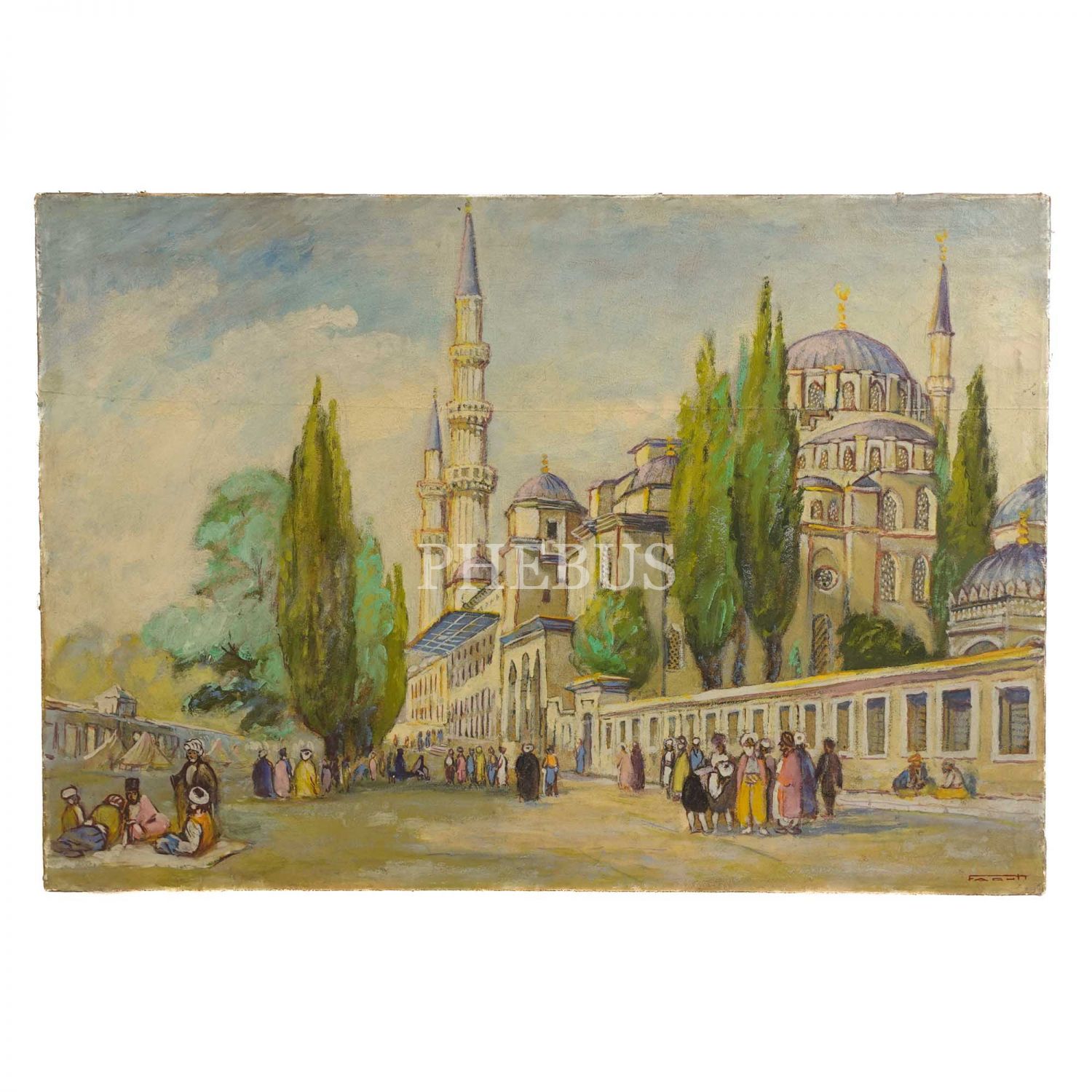 Ressam ve karikatürist Faruk Alpkurt´un fırçasından, Faruk imzalı, tuval üzerine yağlıboya İstanbul´da cami önünde insanlar temalı resim, 45x65 cm...