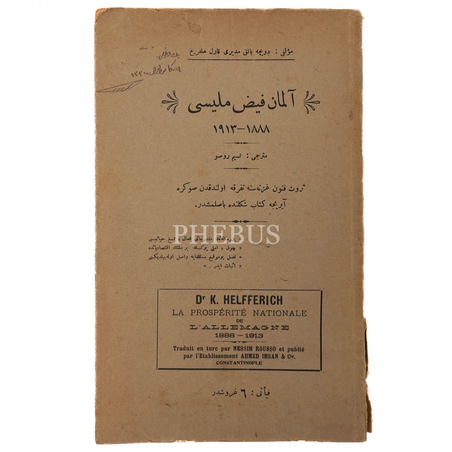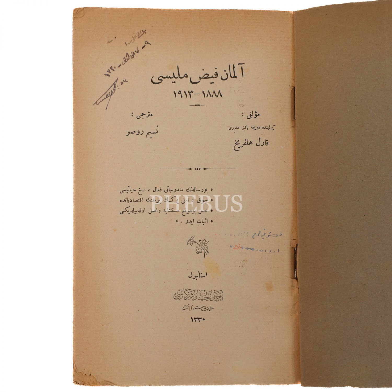 ALMAN FEYZ-İ MİLLÎSİ 1888-1913, Deutch Bank Müdürü Karl Helffrich, (Çeviren: Nesim Ruso), 1330, Matbaa-i Ahmed İhsan, 119 sayfa, 22x13 cm...