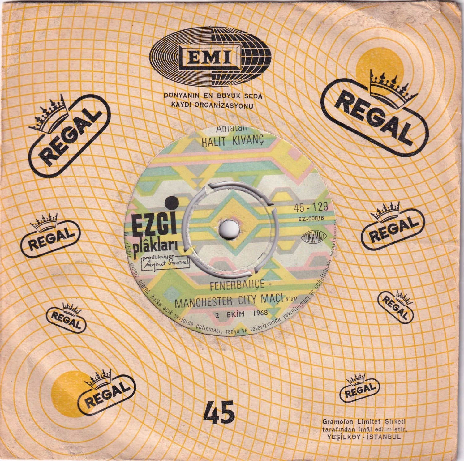 45'lik Plak, A: Şampiyonlar Şarkısı (Halit Kıvanç-T. Dalar), Vasfi Uçaroğlu Orkestrası, B:Fenerbahçe-Manchester City (2 Ekim 1968) Anlatan: Halit Kıvanç, Ezgi Plakları.