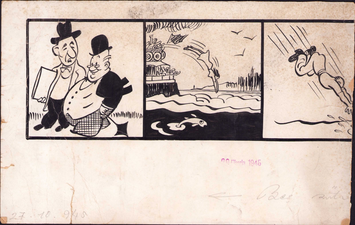 Cemal Nadir Güler'in ıslak imzalı karikatür, Cemal Nadir Güler imzalı, 29 Teşrinievvel 1945 tarihli, iki parça haliyle, 45x9 cm.
