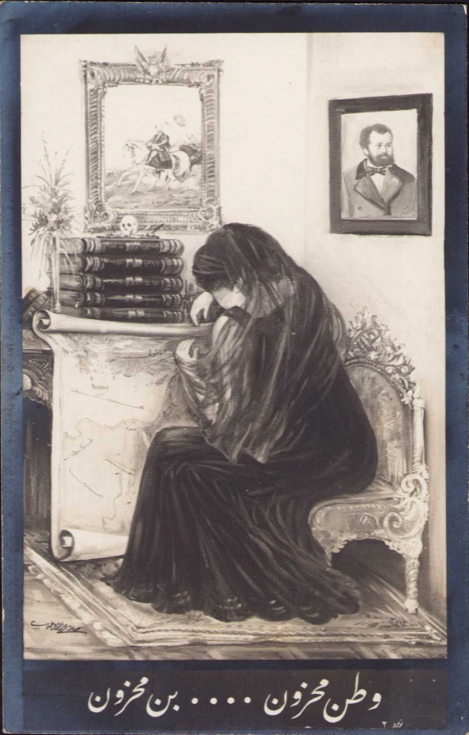 Osmanlı propaganda kartı, Osmanlıca 'Vatan Mahzun Ben Mahzun' yazılı ve Ressam Salahaddin Ömer'in bir eseri görselli kartpostal, Carte Postale 'Rajar'.
