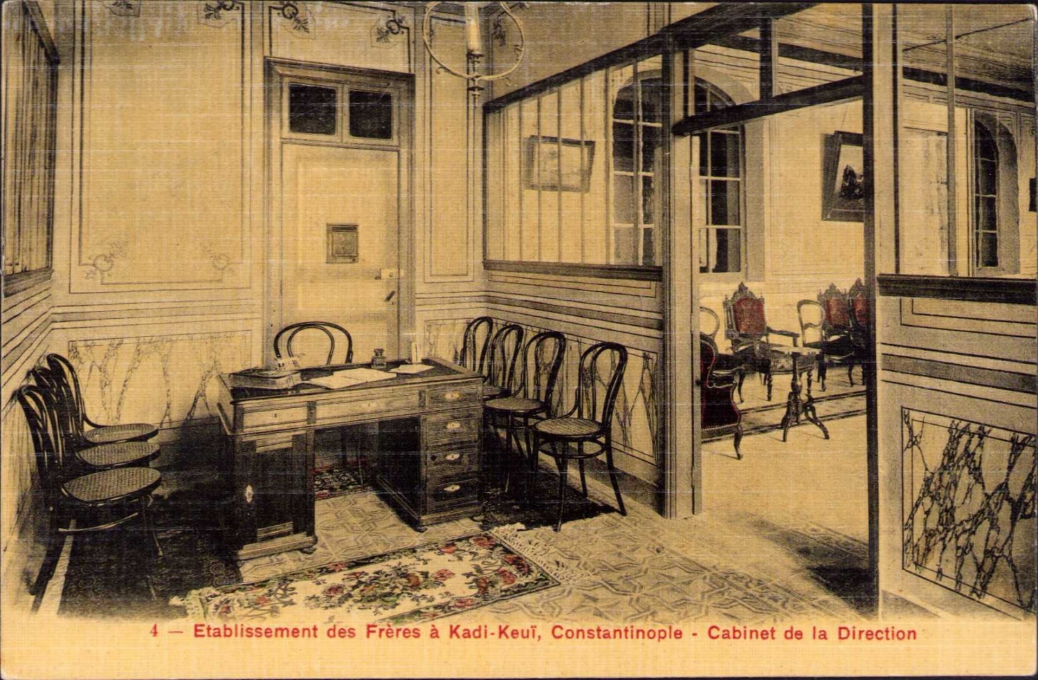 Osmanlı ipek kartpostal, Saint Joseph Lisesi Müdür Odası, Fransızca 'Etablissement des Fréres a Kadi-Keui, Constantinople - Cabinet de la Direction'.