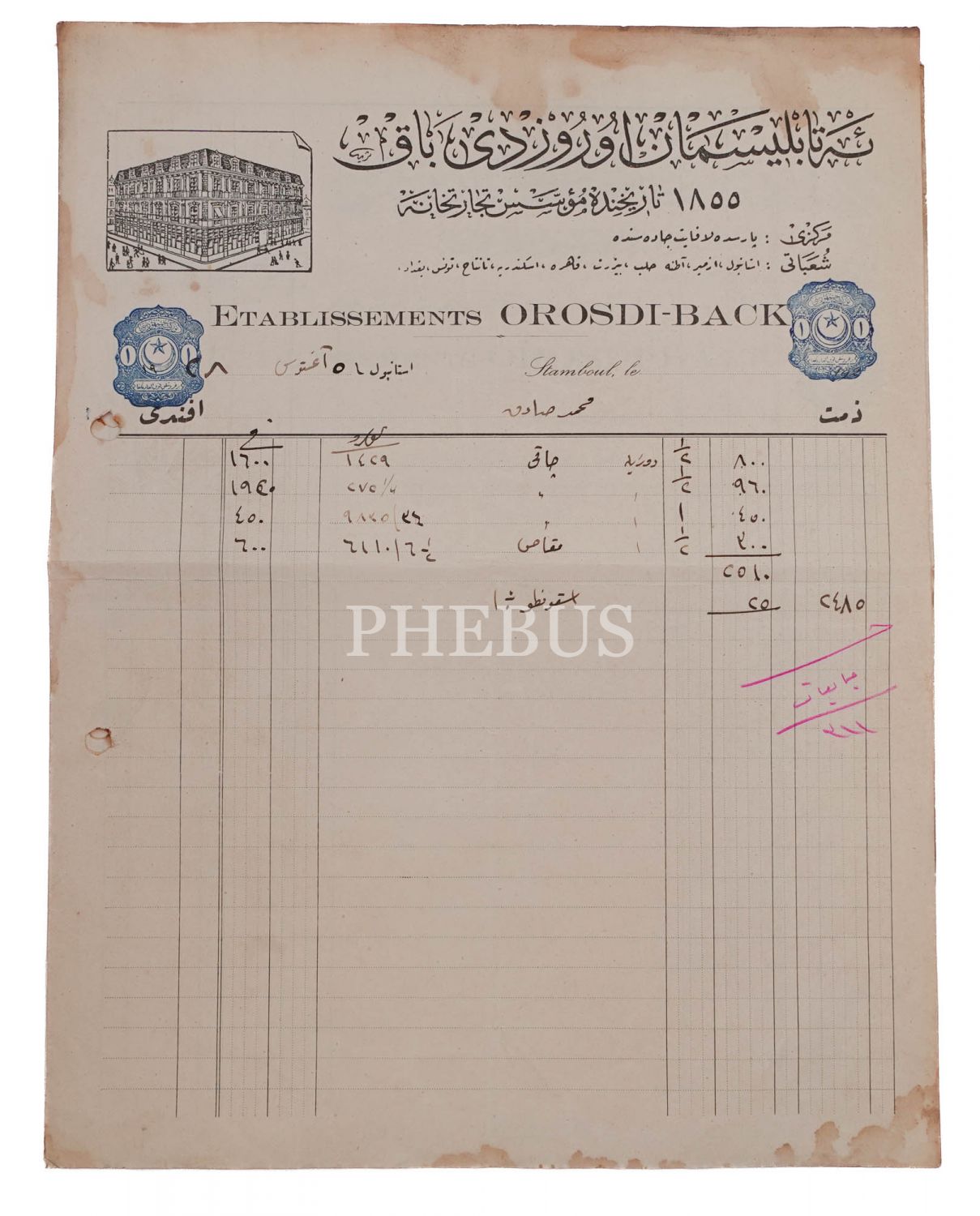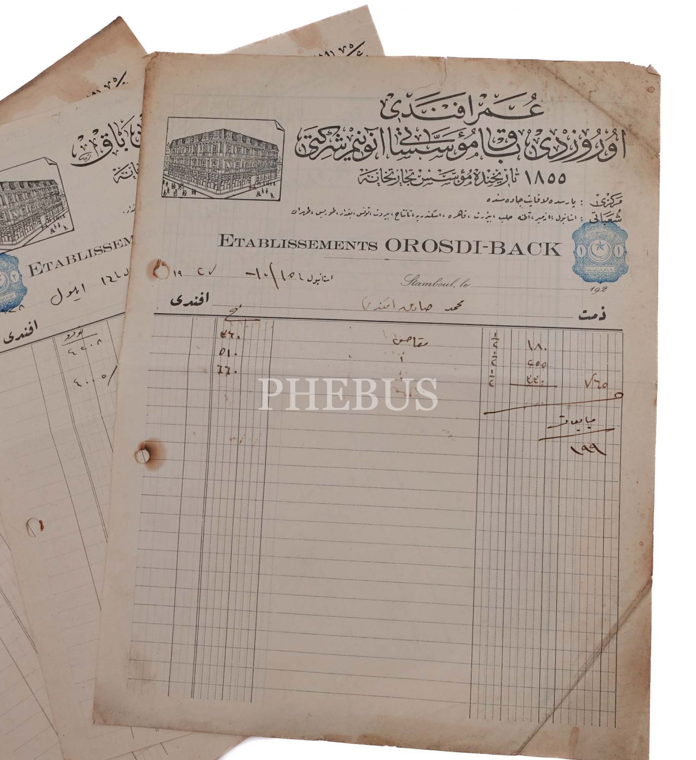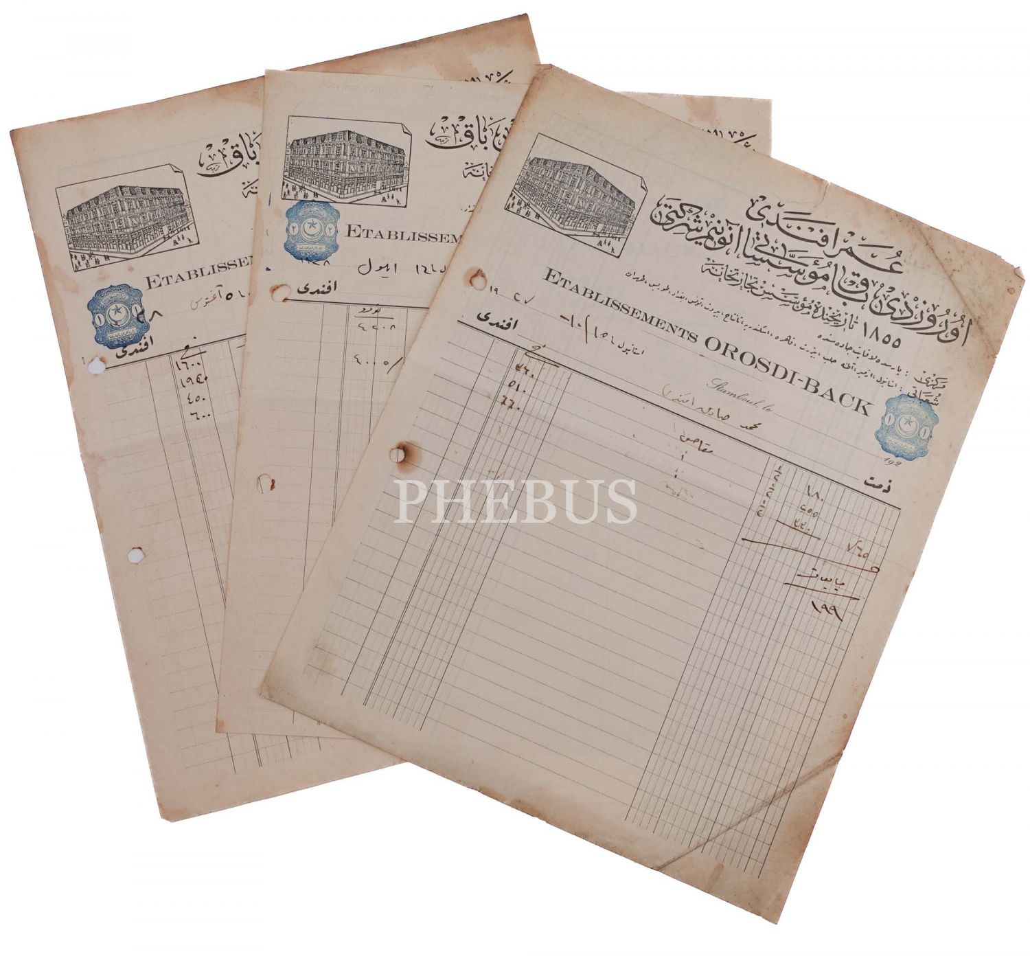 "Etablissements Orosdi-Back" firmasının, 1927 ve 1928 tarihlieri arasında kesilmiş Fransızca ve Osmanlıca üç adet faturası, 23x29 cm...