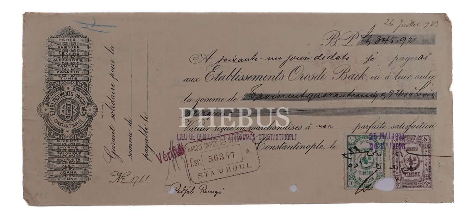 "Etablissements Orosdi-Back" firması tarafından 1923 senesinde düzenlenmiş senedi, 28x13 cm...