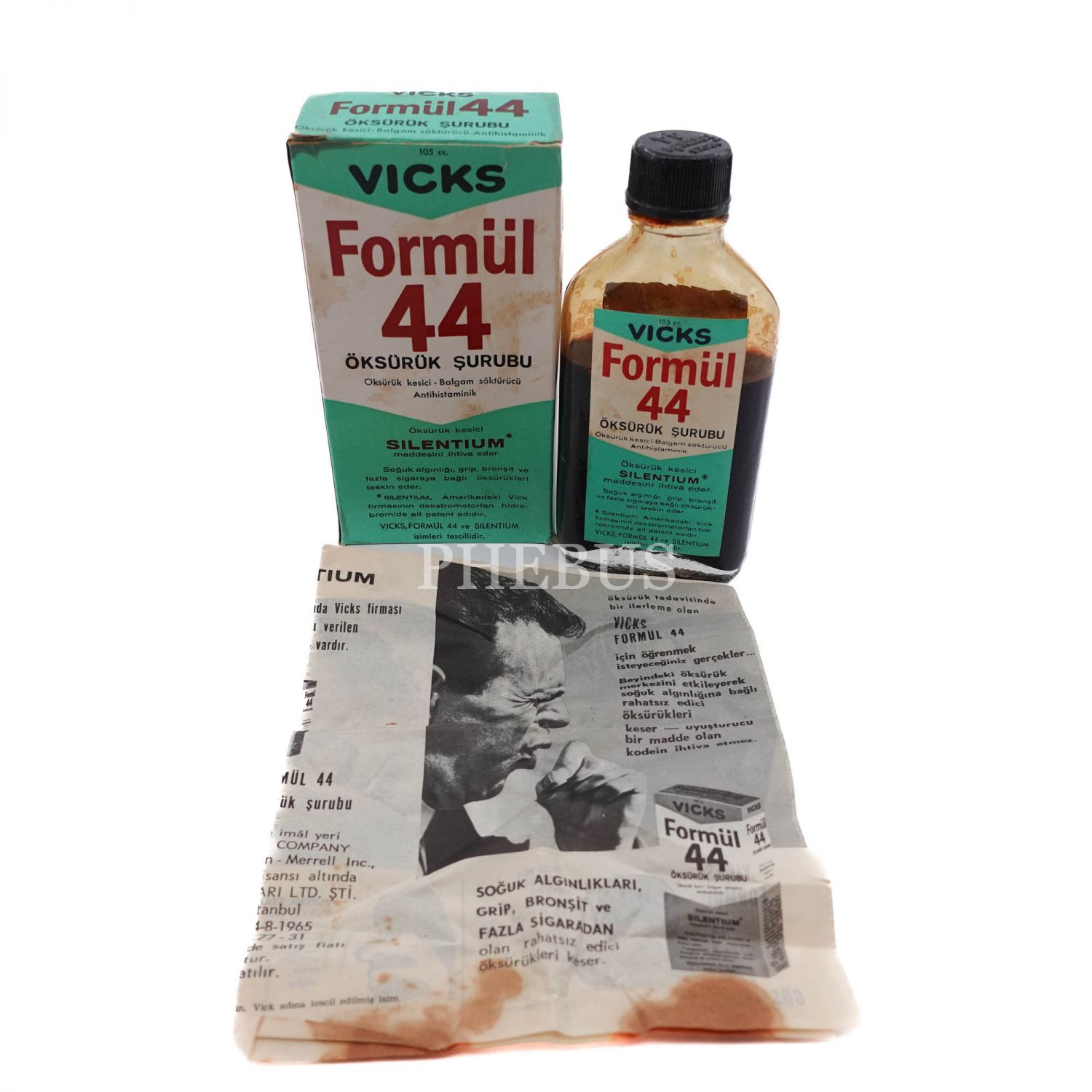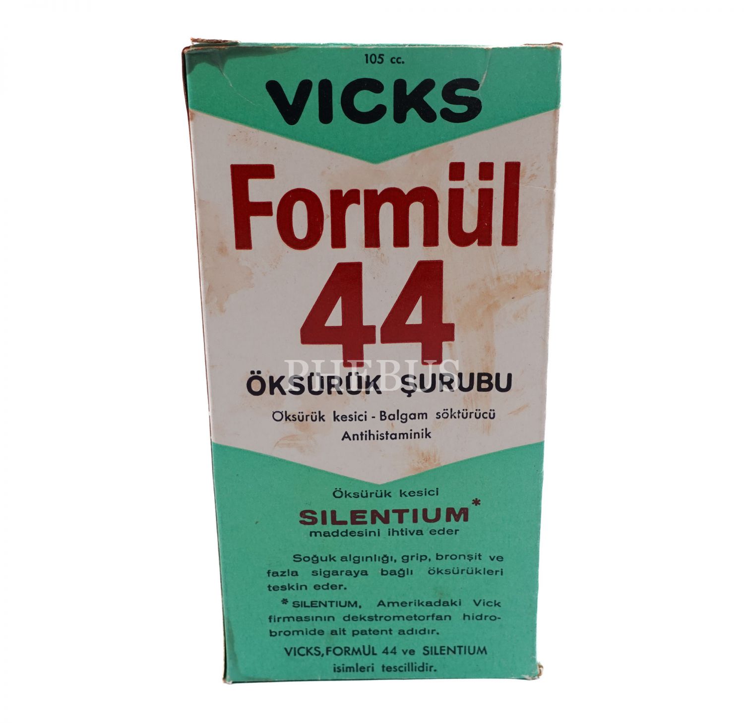 Prospektüsünün de bulunduğu orijinal kutusunda "Vicks Formül 44" şişesi, 6x13x3 cm...