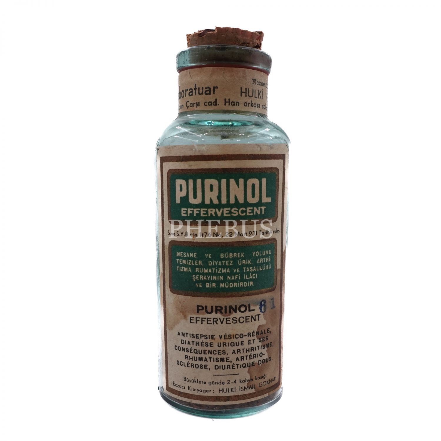 "Purinol" ilacının cam şişesi, 13x5 cm...