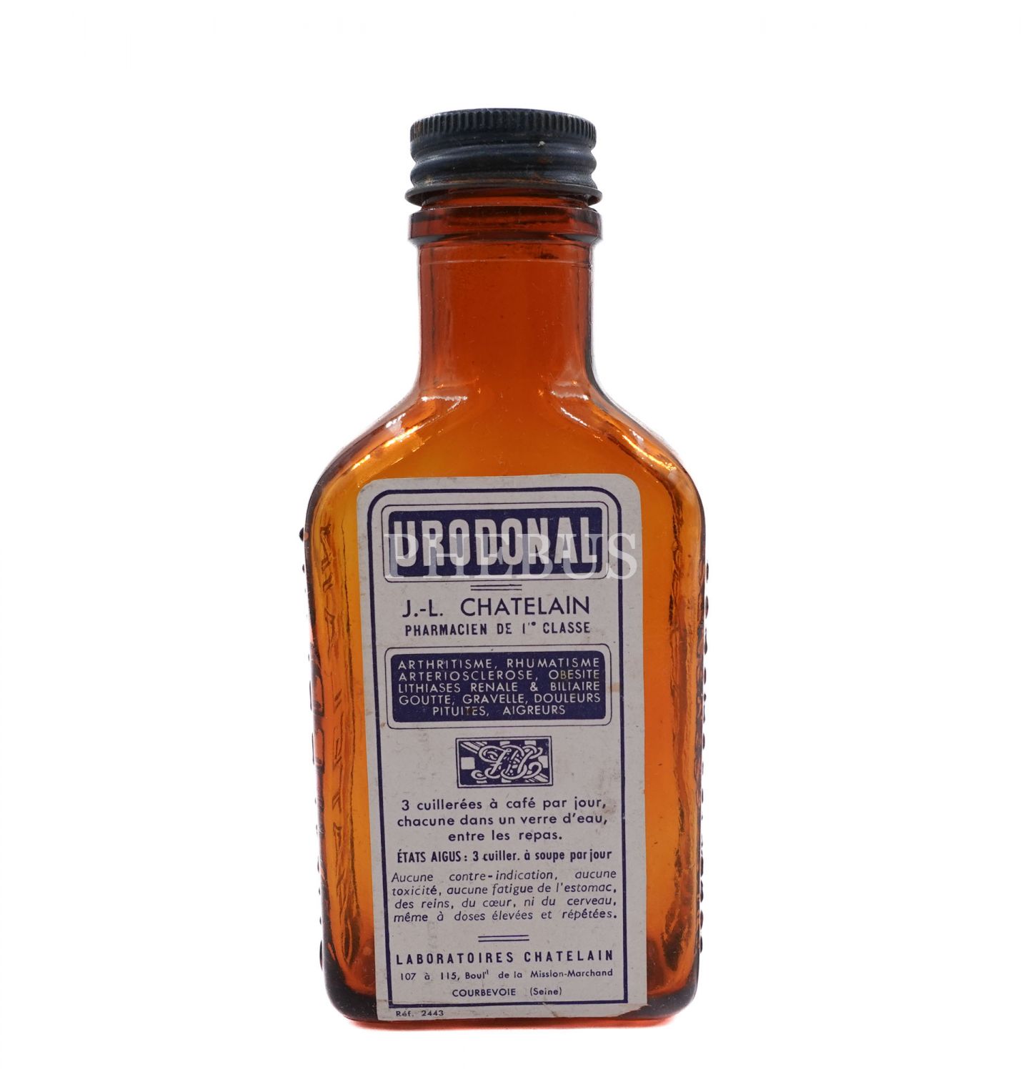 "Urodonal" ilacının, kabartma yazılı ve Fransızca etiketli cam şişesi, 15x6 cm...