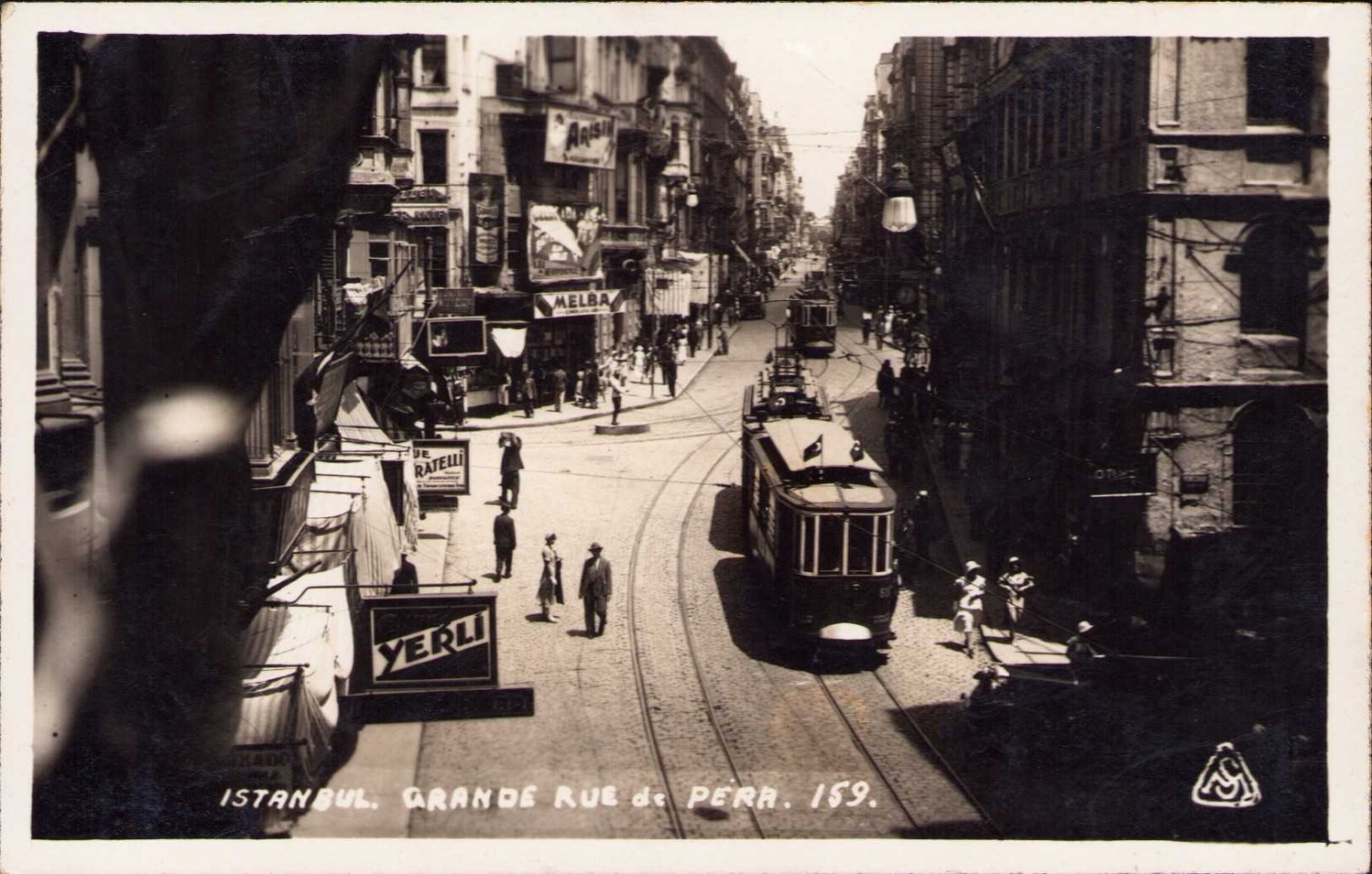 İstiklal Caddesi ve tramvay görselli, Fransızca 'Istanbul Grande Rue de Pera' yazılı kartpostal.