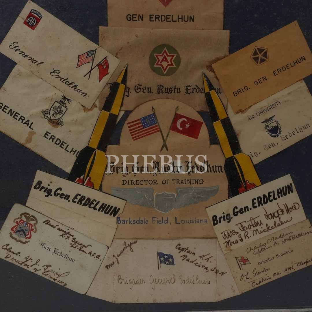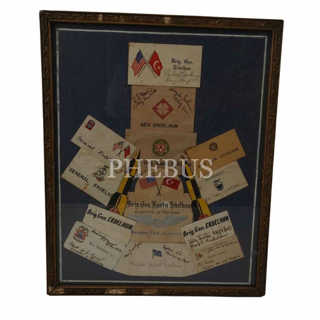 27 Mayıs Darbesi'nde cuntacılara katılmayarak hükümet taraftarı bir tutum izleyen ve bu sebeple darbeden sonra Yassıada'ya gönderilip, tüm rütbeleri sökülerek er statüsüne indirilen Türk Silahlı Kuvvetleri´nin 10. Genelkurmay Başkanı Rüştü Erdelhun´un, uluslararası görevlerinde kullandığı kartvizitlerinden oluşturduğu kolaj, çerçevesiyle birlikte 33x41 cm...