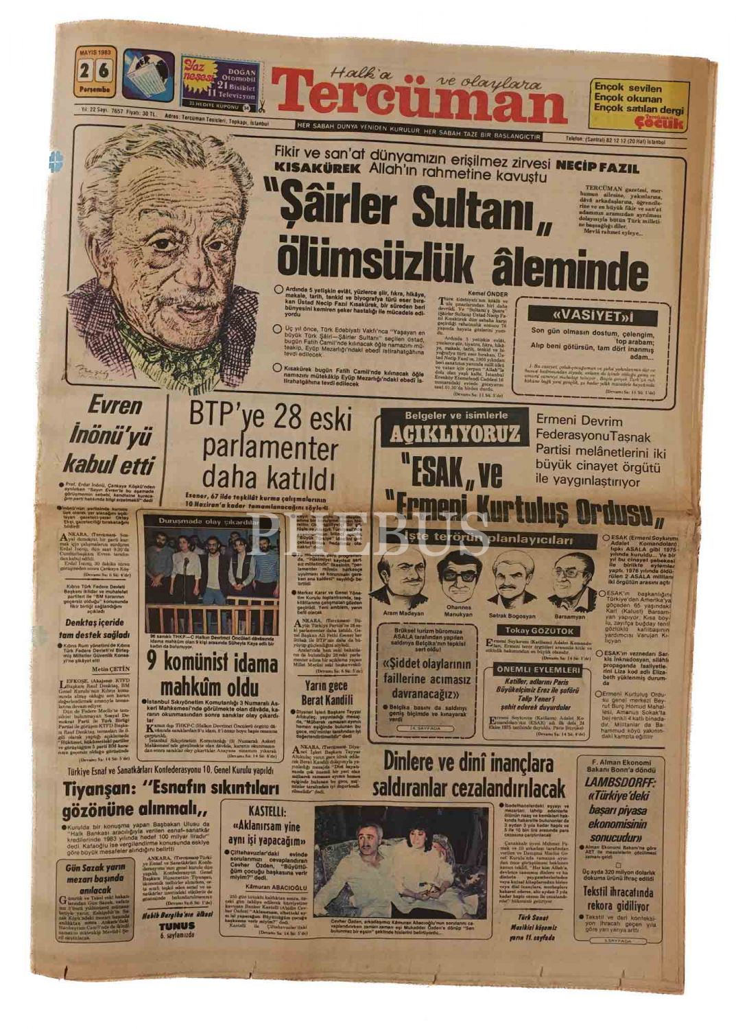 "Şâirler Sultanı Ölümsüzlük Âleminde" manşetli TERCÜMAN gazetesi, 26 Mayıs 1983, 40x58 cm...