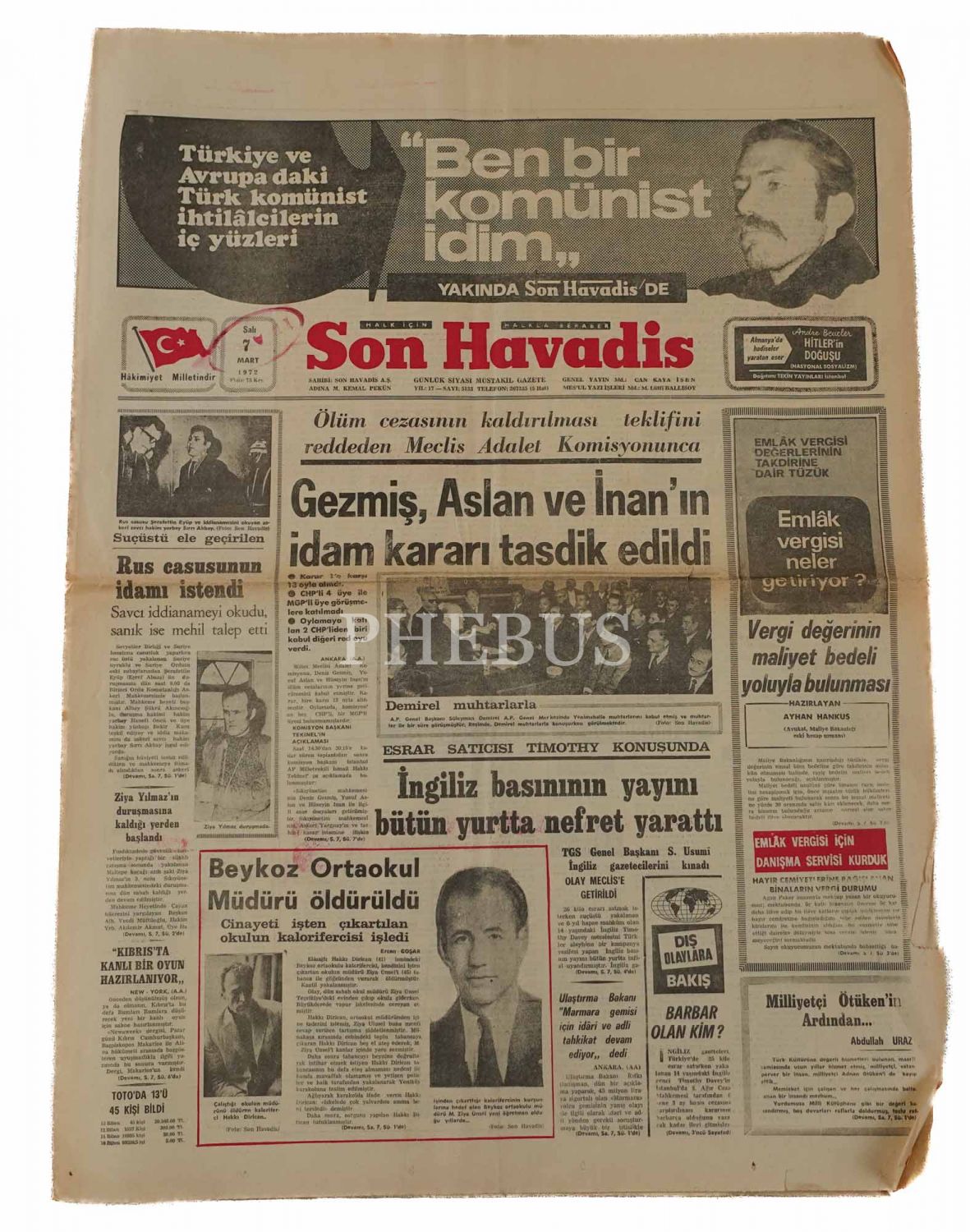 "Gezmiş, Aslan ve İnan´ın İdam Kararı Tasdik Edildi" manşetli SON HAVADİS gazetesi, 7 Mart 1972, 43x59 cm...