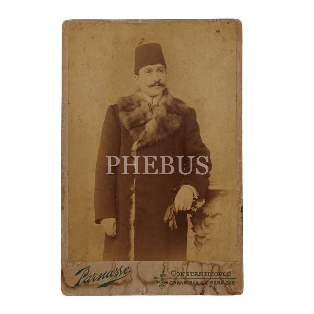 Dikkat çekici kürk yaka paltosuyla poz veren beyefendinin kabin fotoğrafı, Parnasse Fotoğrafhanesi, Constantinople, 10x16 cm...