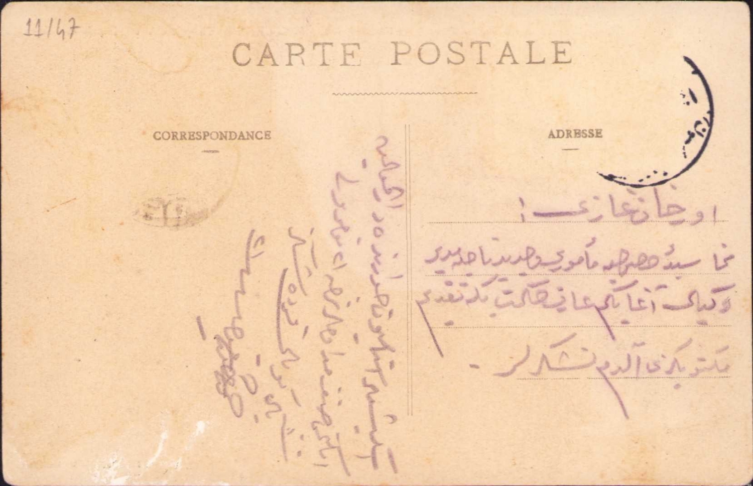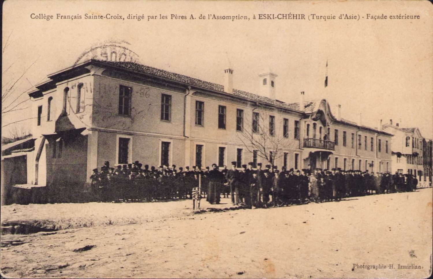 Osmanlı kartpostal, Eskişehir, Eski-chehir, Fransızca "College Français Sainte Croix dirige par les Peres A. de l'Assomption" yazılı, Sainte Croix Koleji binası, Osmanlıca ithaflı ve imzalı, Fotoğraf: H. İzmirlian.