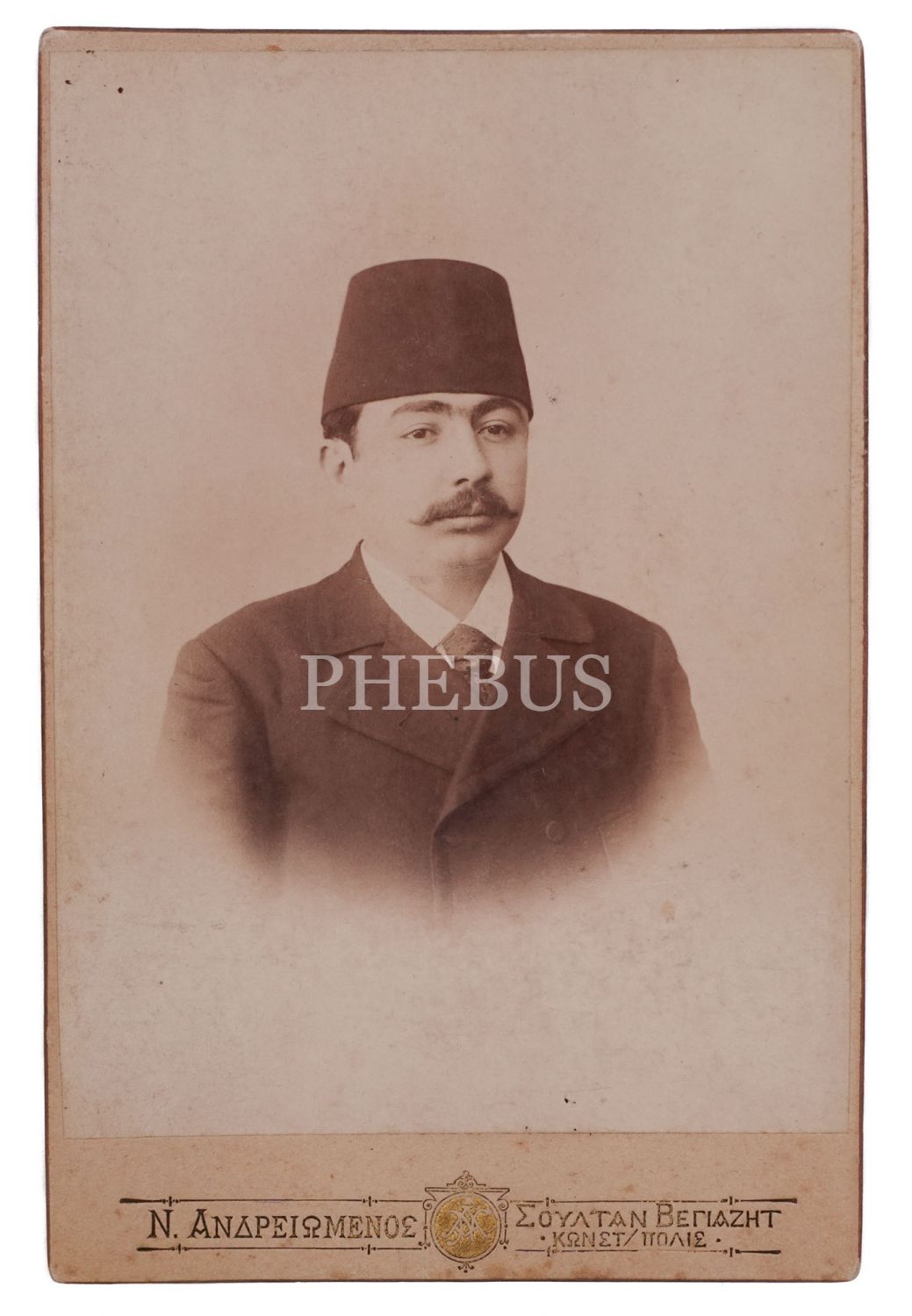 Fesli ve şık giyimli bir beyefendinin Nikolas Andriomenos Fotoğrafhanesi´nde çektirdiği hatıra fotoğrafı, 11x17 cm...