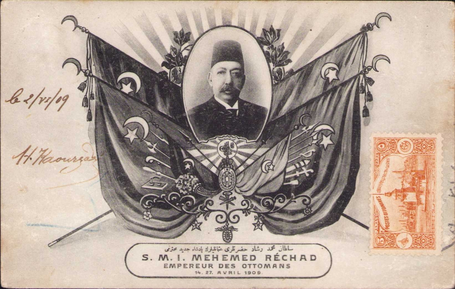 Osmanlı kartpostal, Sultan Mehmed Reşad ve Osmanlı tuğrası görselli, Osmanlıca "Sultan Mehmed Reşad Hazretleri Osmanlıların Padişah-ı Cedid-i Muhteremi" yazılı, pullu, 1909 tarihli, Fransızca imzalı ve ithaflı.