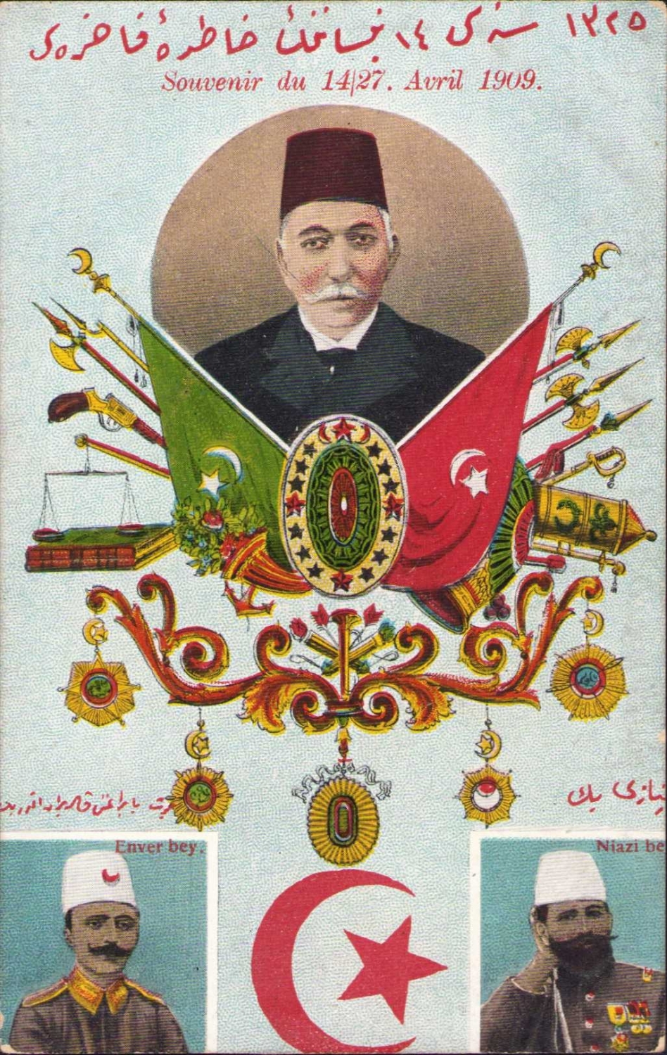 Osmanlı kartpostal, Sultan Reşad, Enver Bey ve [Resneli] Niyazi Bey, II. Meşrutiyet temalı, Osmanlıca "1325 senesi 14 Nisan'ının Hatıra-i Fahiresi" ve Fransızca "Souvenir du 14/27 Avril 1909" yazılı, Editör: J. Matalon & Fils, Galata.