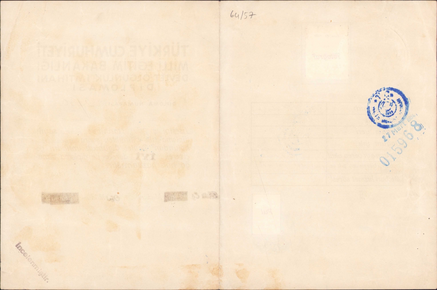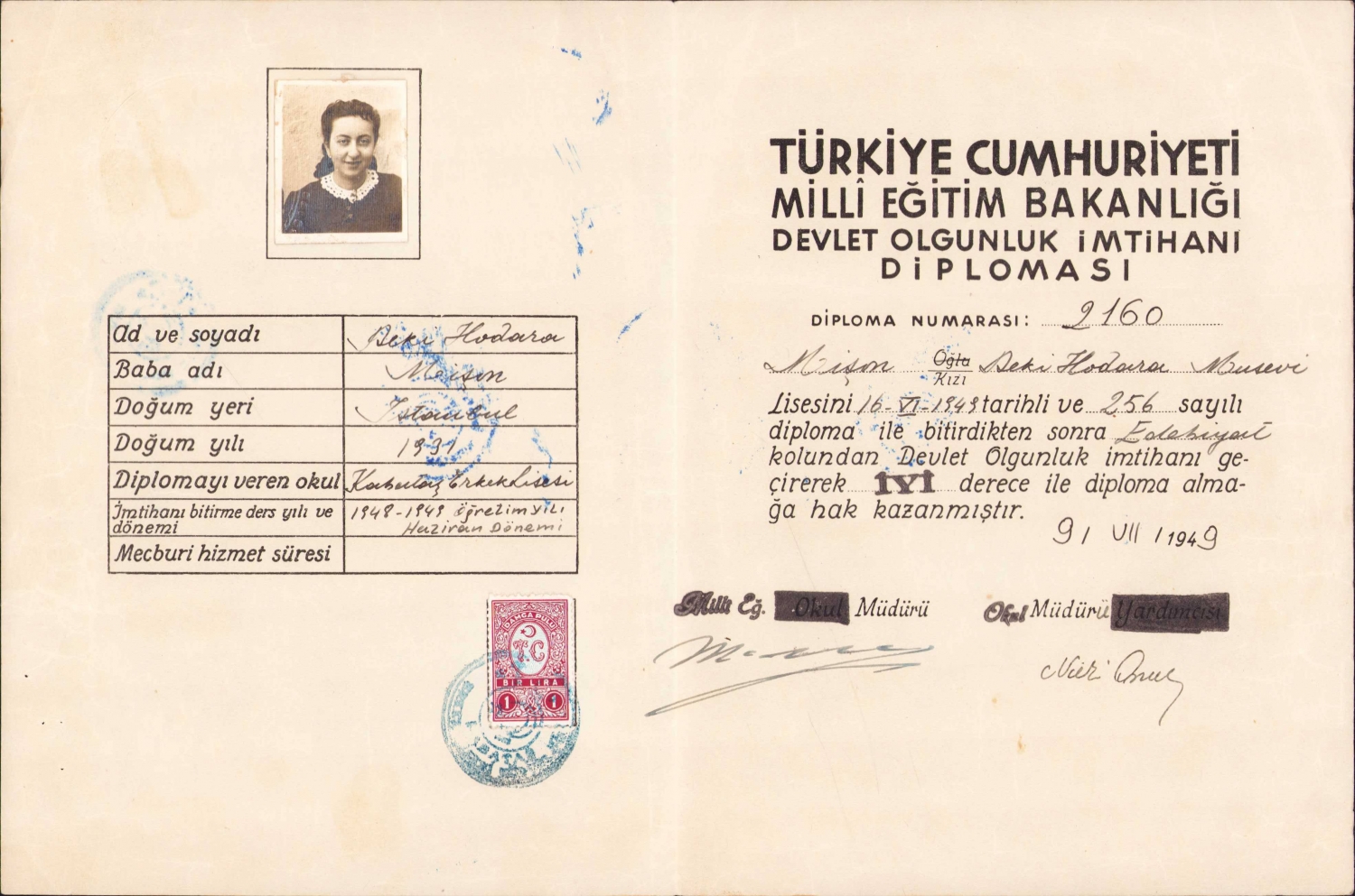 Yahudi ebru sanatçısı Beki Hodara'ya ait Milli Eğitim Bakanlığı Devlet Olgunluk İmtihanı Diploması, 1949 tarihli, damgalı ve pullu, 33x22 cm.