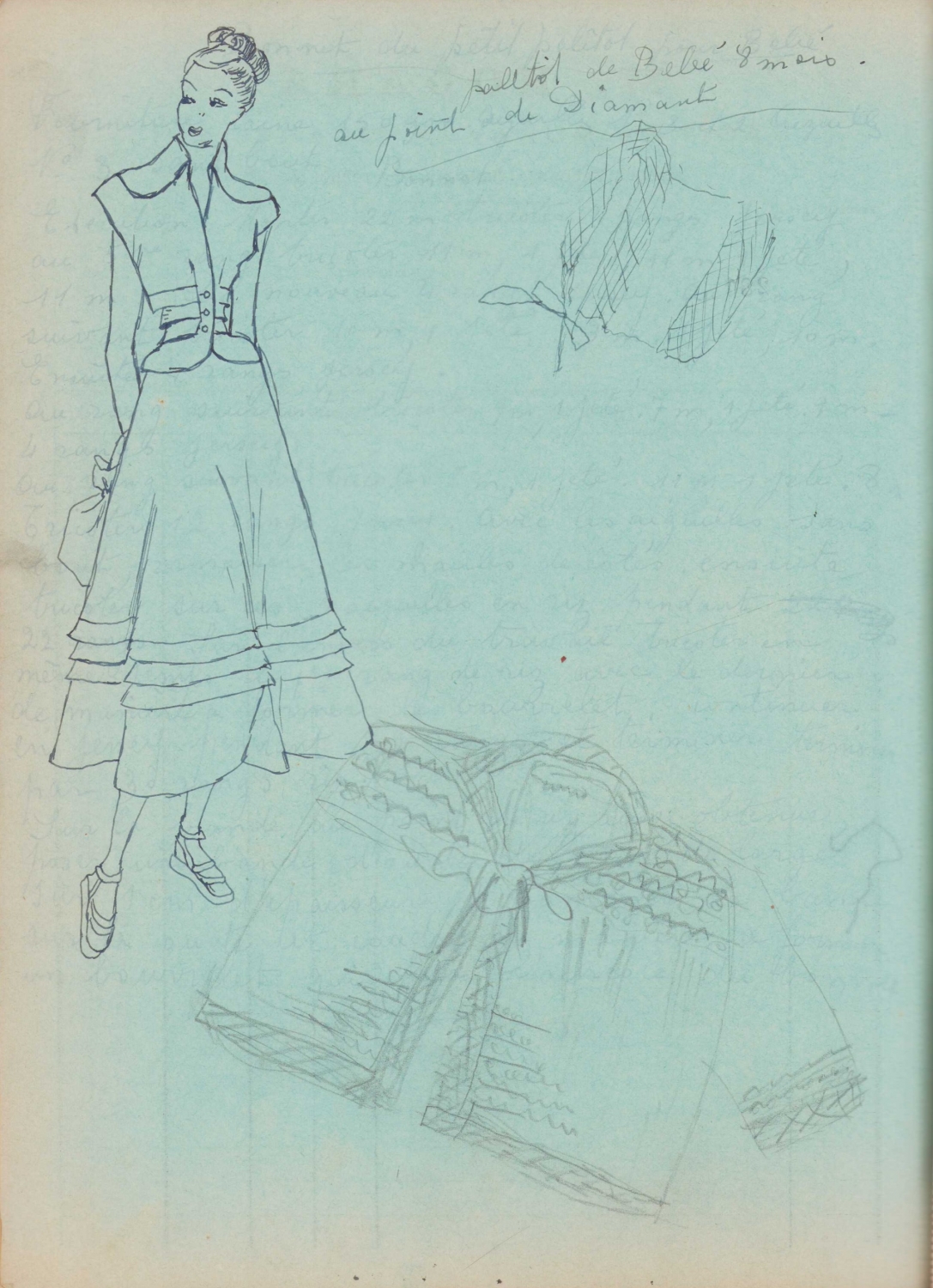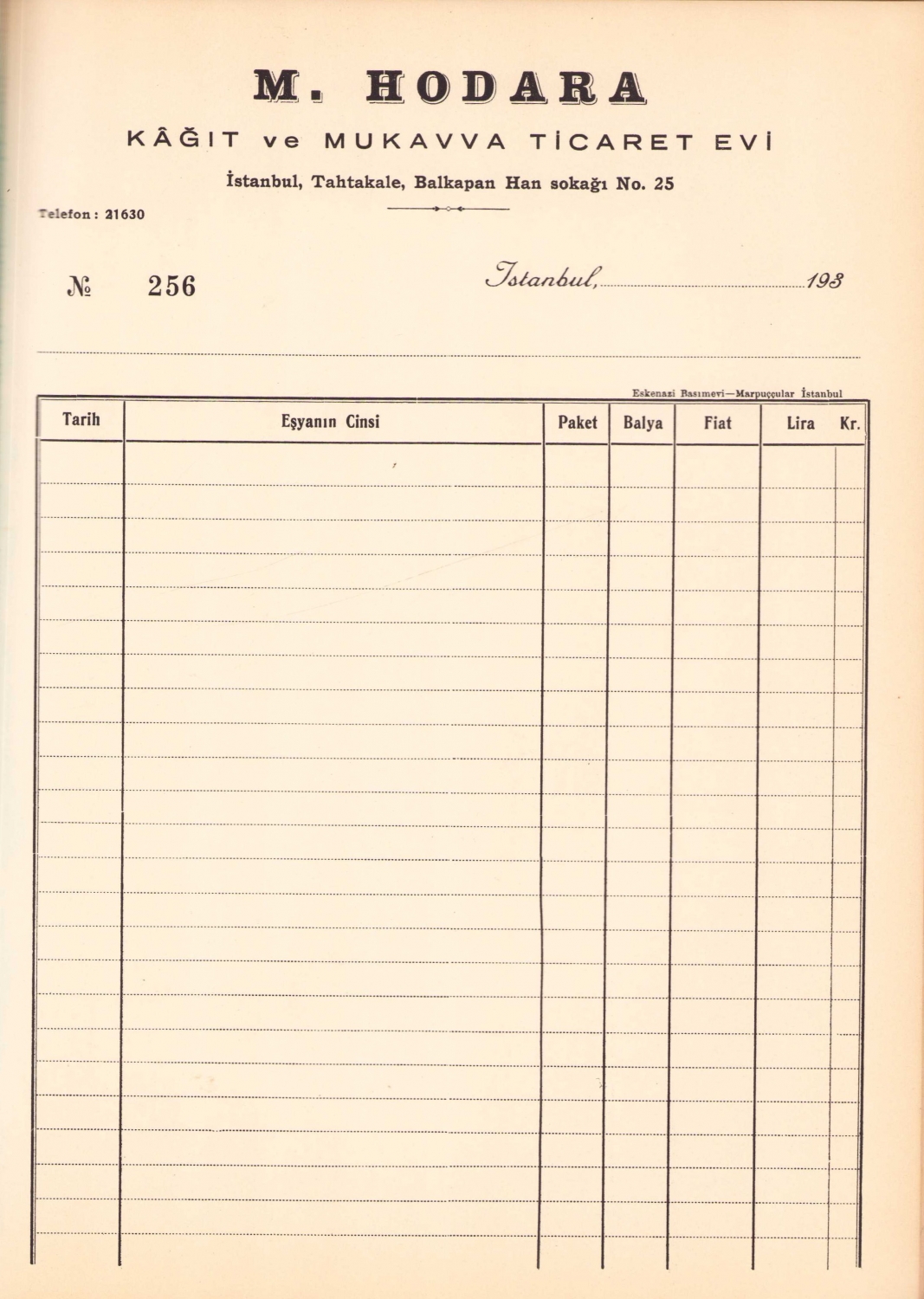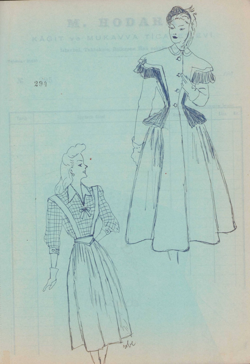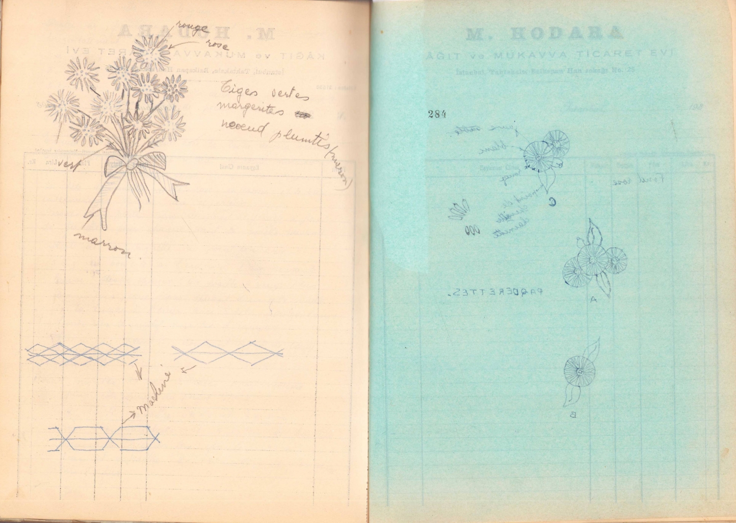 Sayfa arkalarında moda ve çiçek çizimleri yer alan Moiz Hodara Kağıt ve Mukavva Ticaret Evi antetli fatura koçanı, 66 sayfa, 22,5x29 cm.