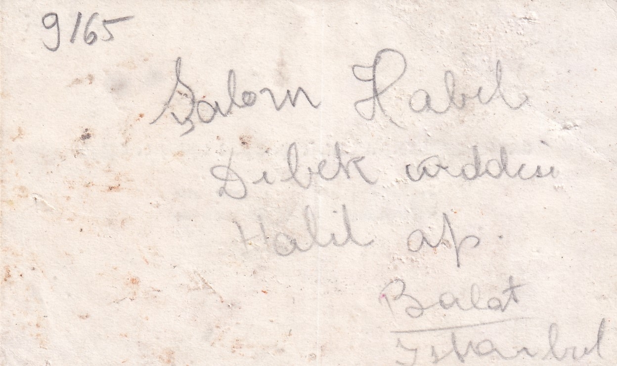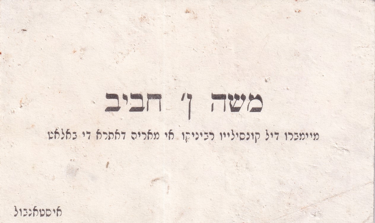 Mıdşe Habip Balat Musevi Cemaati Hahambaşı'nın İstanbul adresli kartviziti, arkasında adres yazılı, İbranice, 8x5 cm.