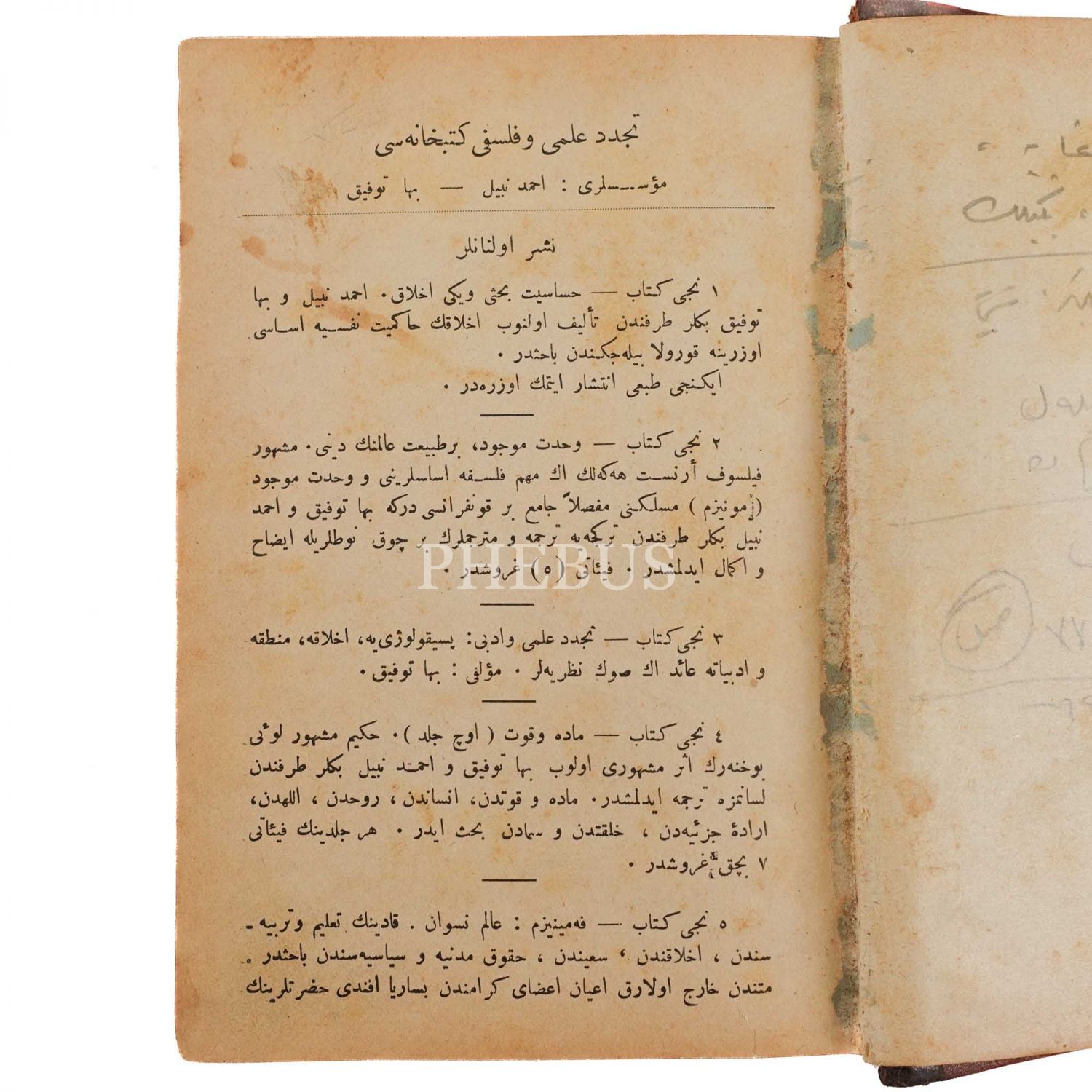 1. PSİKOLOJİ: İLM-İ AHVAL-İ RUH, Ahmed Nebil, Baha Tevfik, Müştereki´l-menfaa Osmanlı Şirketi Matbaası 2.TARİH-İ FELSEFE, Ahmed Nebil, Baha Tevfik, Suhulet Kütüphanesi 3. NIETZSCHE HAYATI VE FELSEFESİ, Ahmed Nebil, Baha Tevfik, Memduh Süleyman, Gayret Kütüphanesi, 128 sayfa, 12x18 cm...