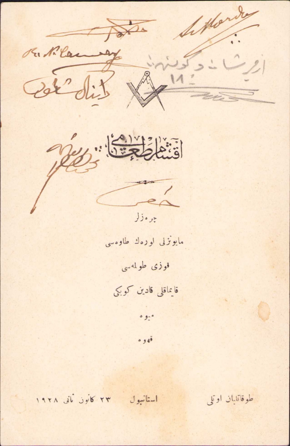 Mason cemiyetinin Osmanlıca 'Akşam Taamı' yazılı menüsü, Tokatlıyan Oteli, İstanbul 23 Kanunısani 1928 tarihli, yemeğe katılanların imzalarıyla, 11x17 cm.