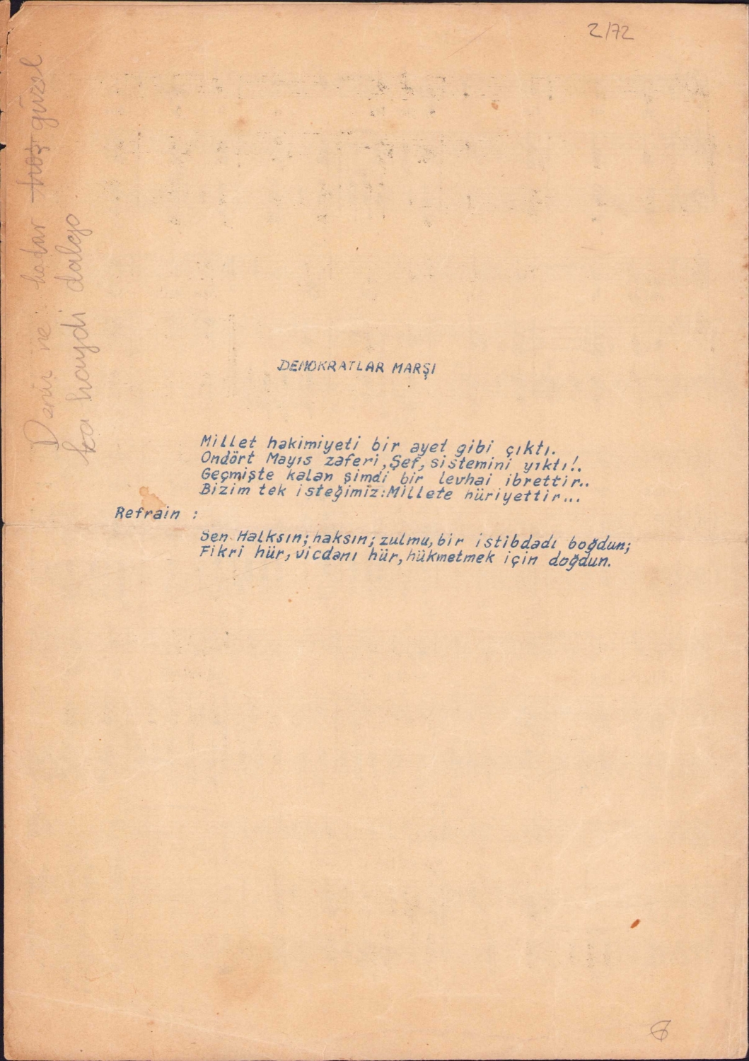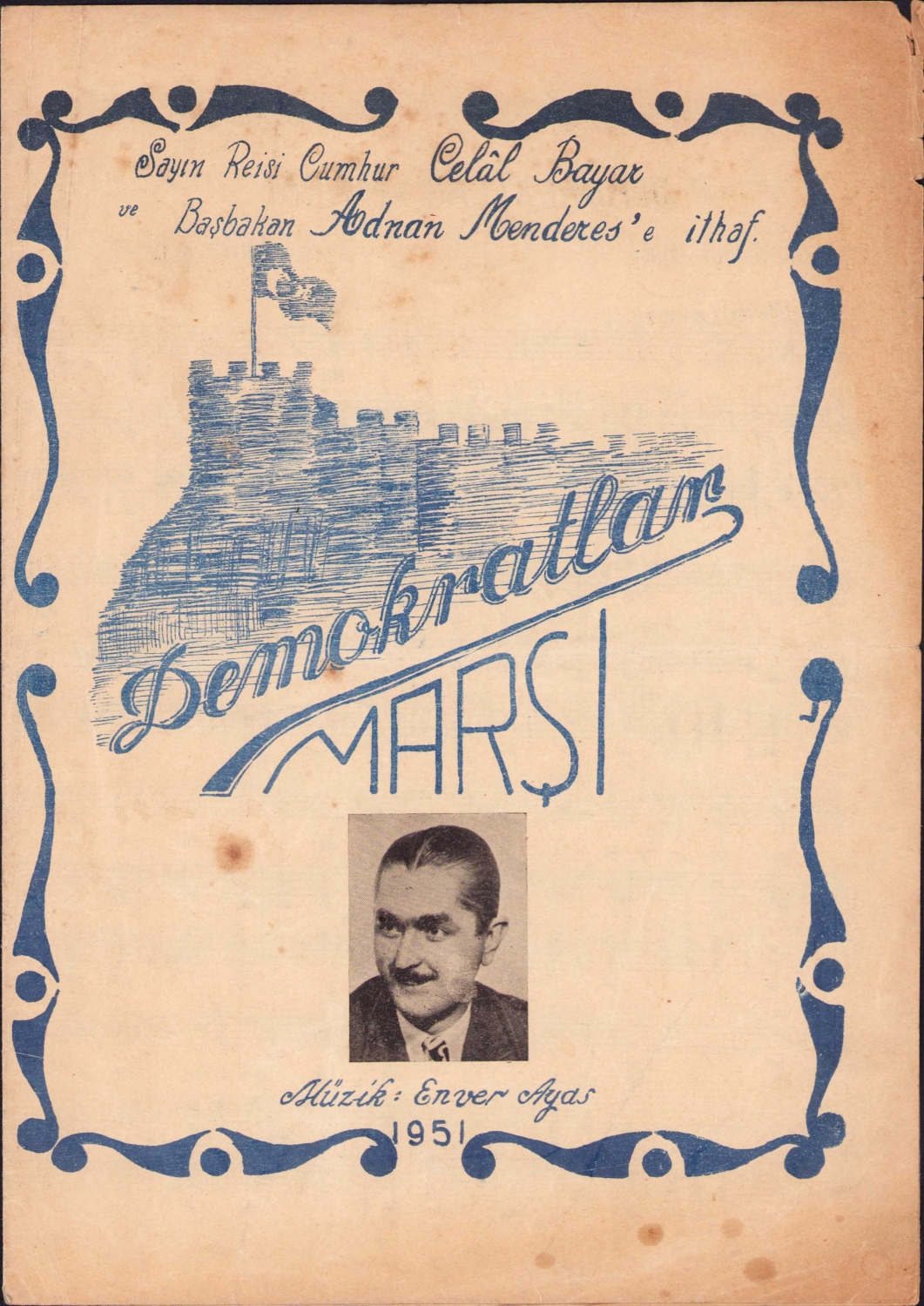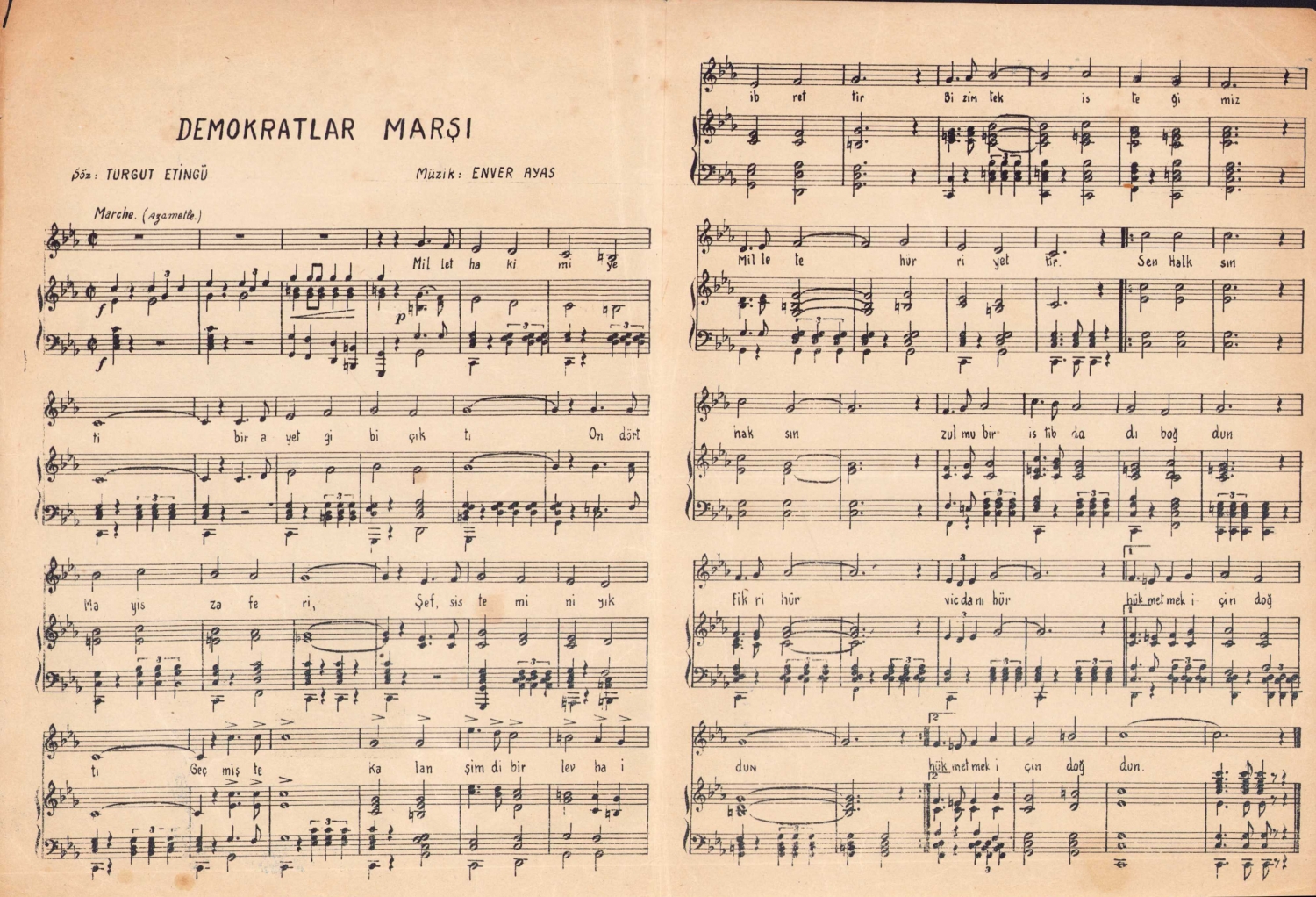 Demokratlar Marşı, 'Sayın Reisi Cumhur Celal Bayar ve Başbakan Adnan Menderes'e ithaf', Müzik: Enver Ayas, Güfte: Turgut Etingü, 1951, 4 sayfa, 20,5x29 cm.