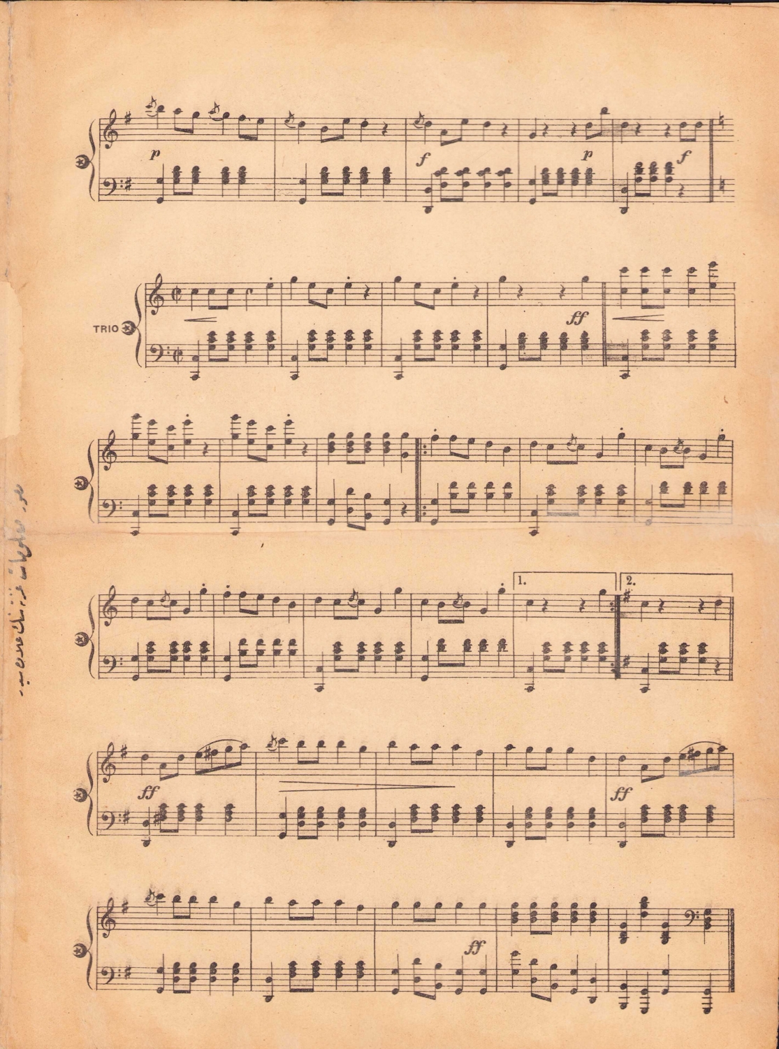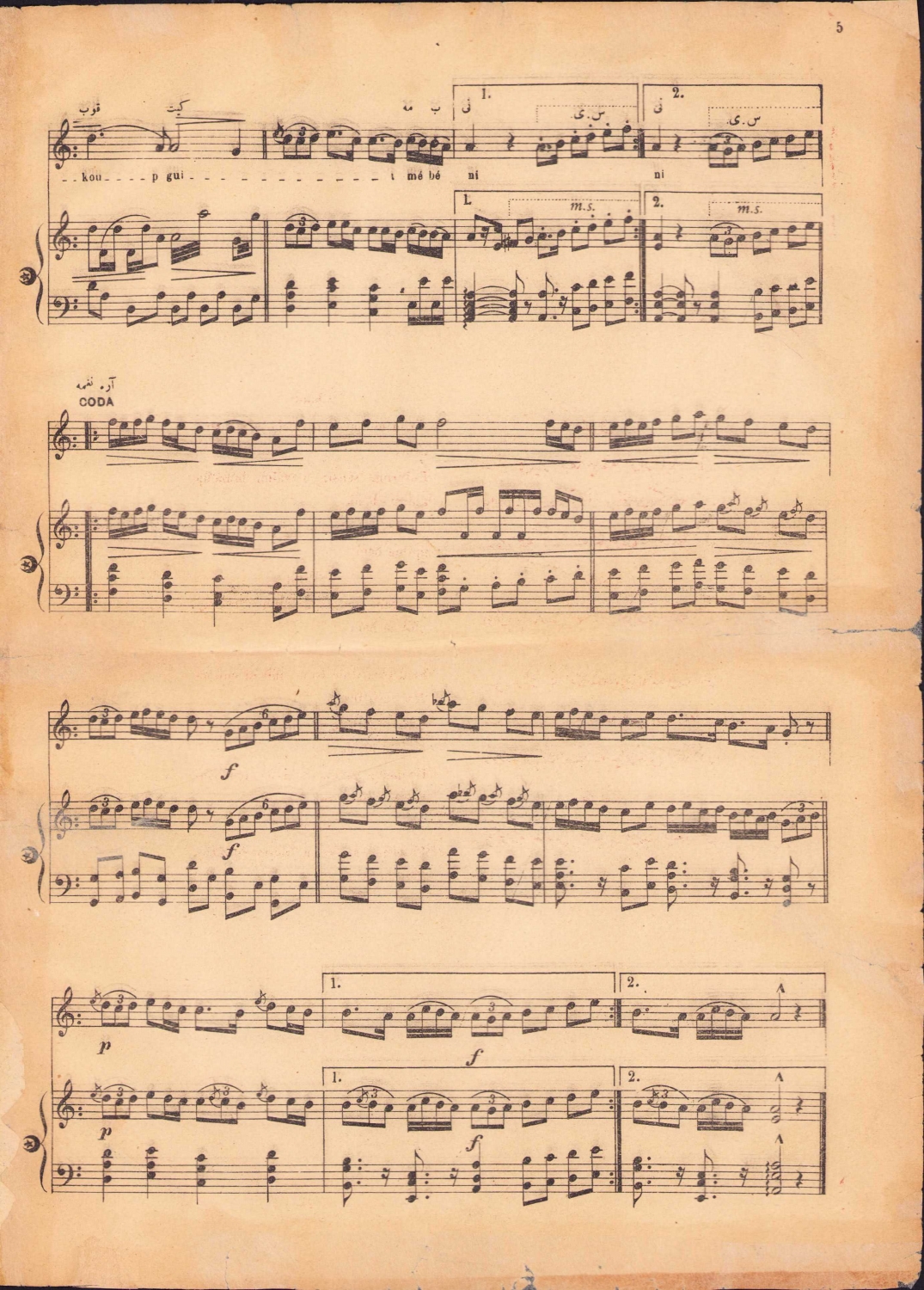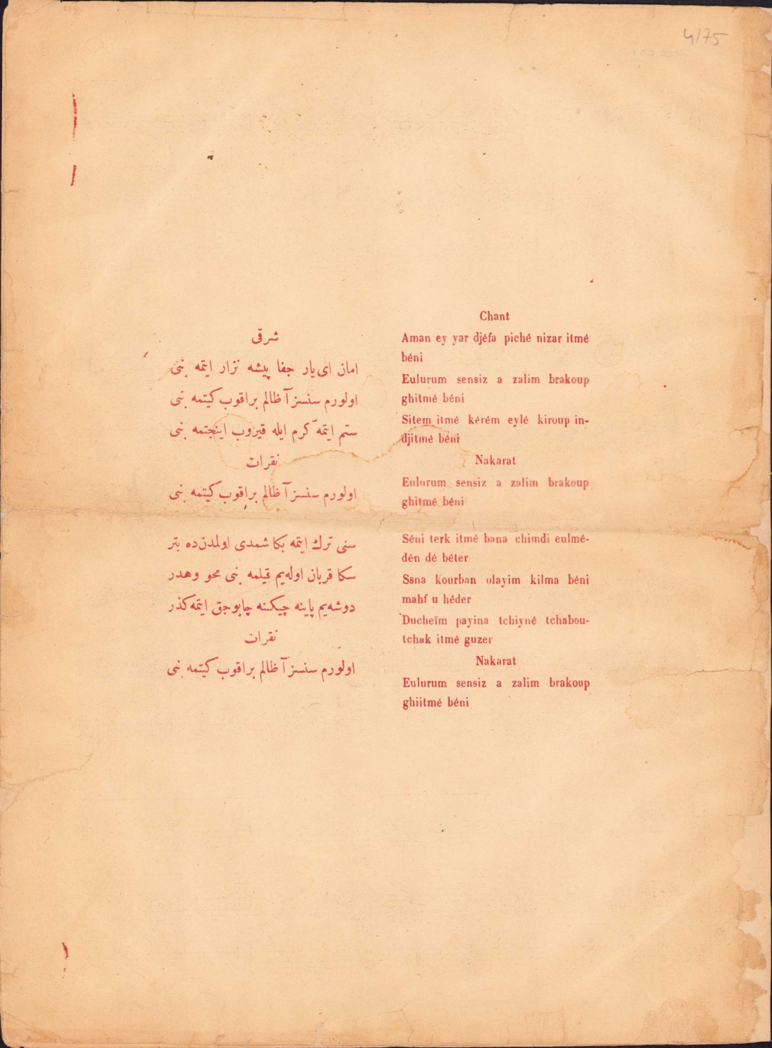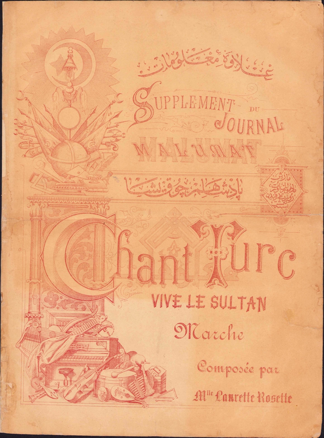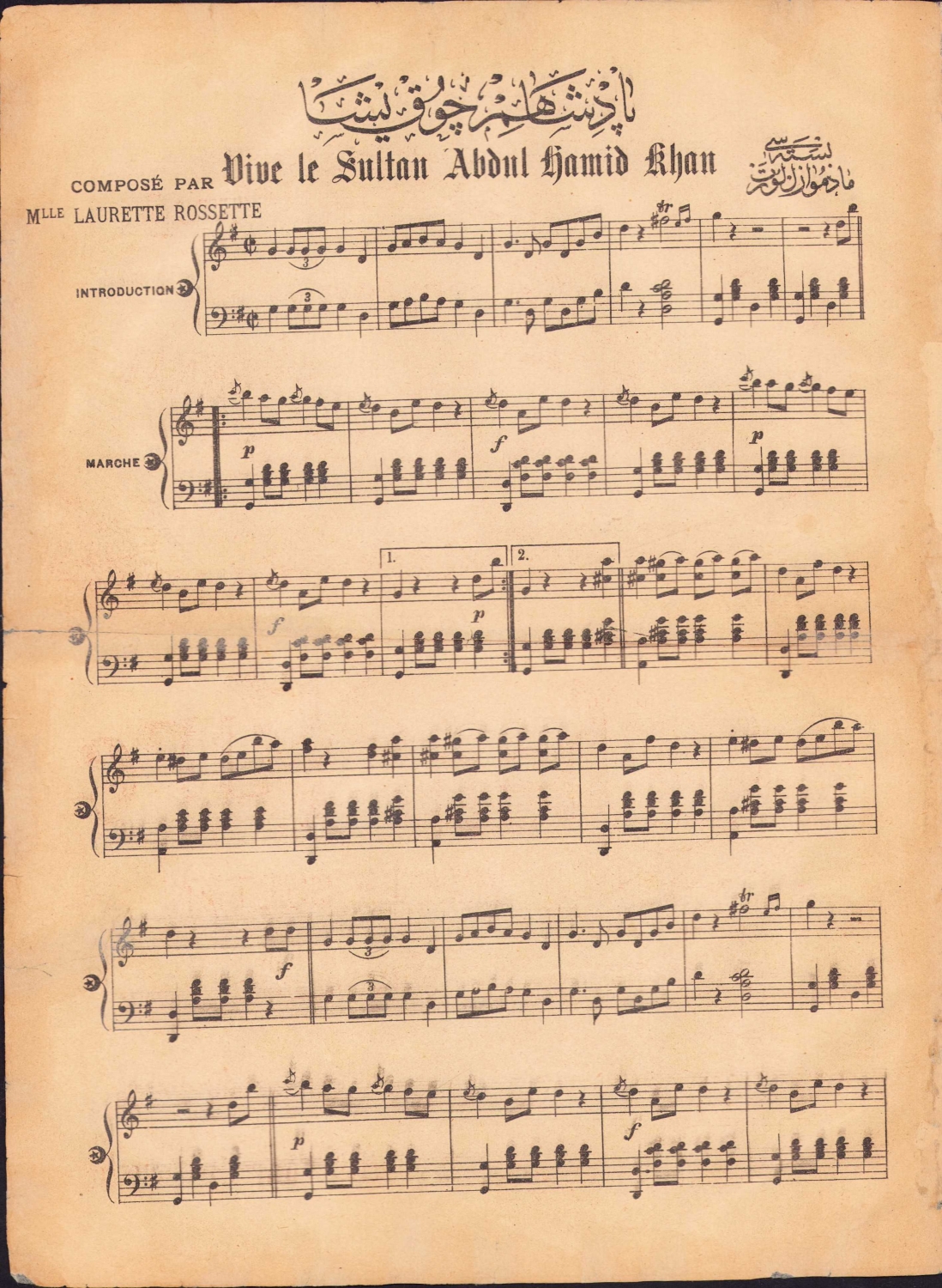 Osmanlıca İlave-i Malumat, Sultan Hamid için yazılmış 'Padişahımız Çok Yaşa' başlıklı eser, Bestekârı:Conrette Rosette, 5 sayfa [4. sayfası eksik], 24x33 cm.